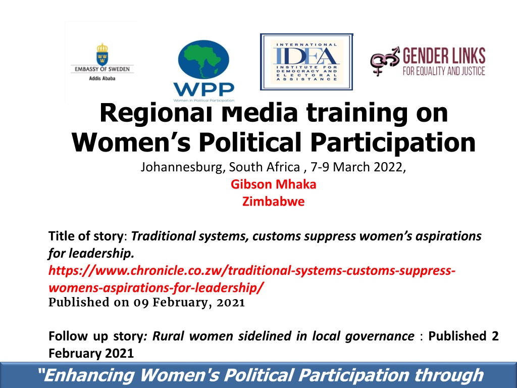 Regional Media training on Women s Political Participation Johannesburg, South Africa , 7-9 March 2022, Gibson Mhaka Zimbabwe Title of story:Traditional systems, customs suppress women s aspirations for leadership. https://www.chronicle.co.zw/traditional-systems-customs-suppress- womens-aspirations-for-leadership/ Published on 09 February, 2021 Follow up story: Rural women sidelined in local governance : Published 2 February 2021 Enhancing Women's Political Participation through media.