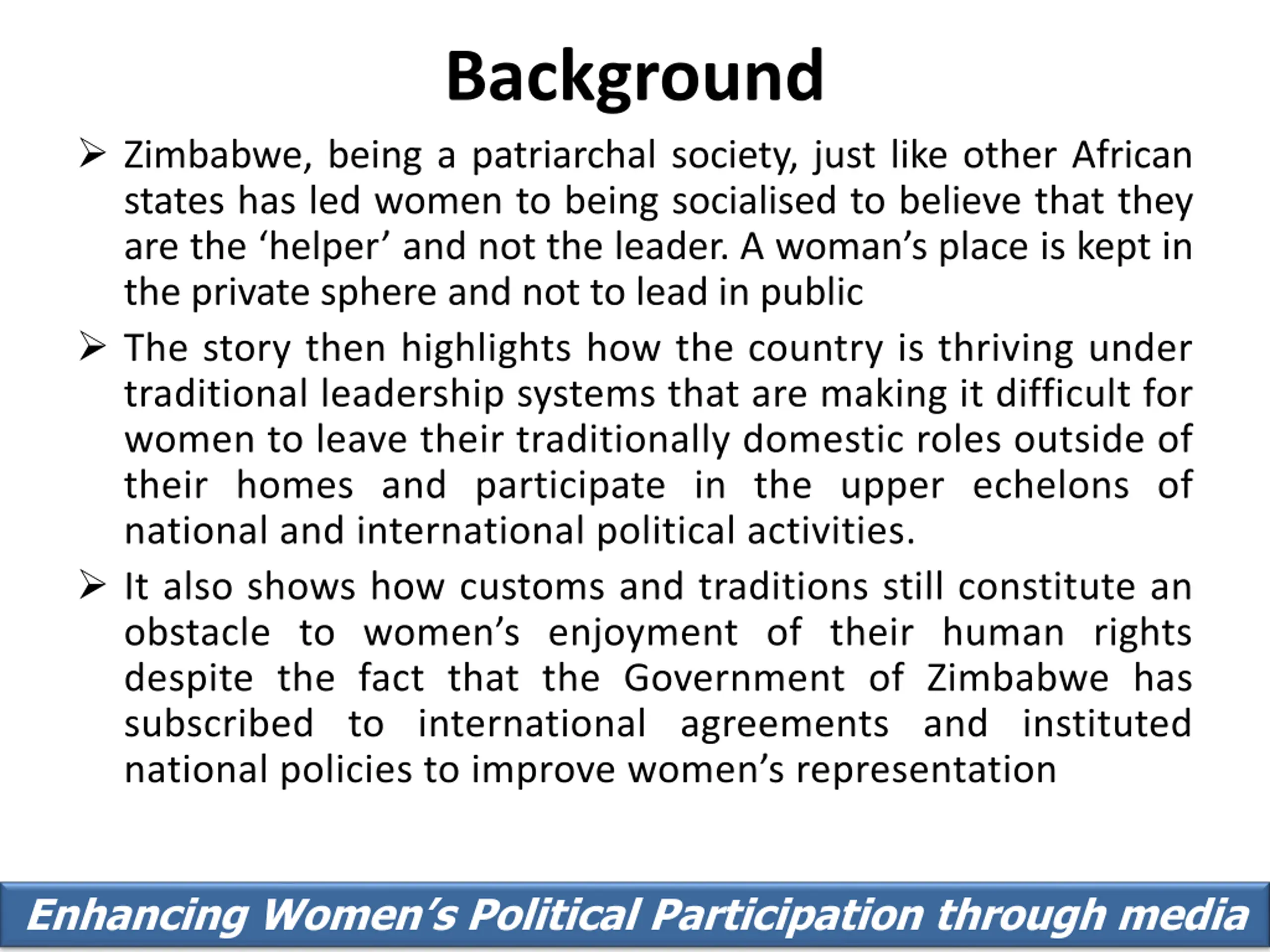 Background Zimbabwe, being a patriarchal society, just like other African states has led women to being socialised to believe that they are the helper and not the leader. A woman s place is kept in the private sphere and not to lead in public The story then highlights how the country is thriving under traditional leadership systems that are making it difficult for women to leave their traditionally domestic roles outside of their homes and participate in the upper echelons of national and international political activities. It also shows how customs and traditions still constitute an obstacle to women s enjoyment of their human rights despite the fact that the Government of Zimbabwe has subscribed to international agreements and instituted national policies to improve women s representation Enhancing Women s Political Participation through media