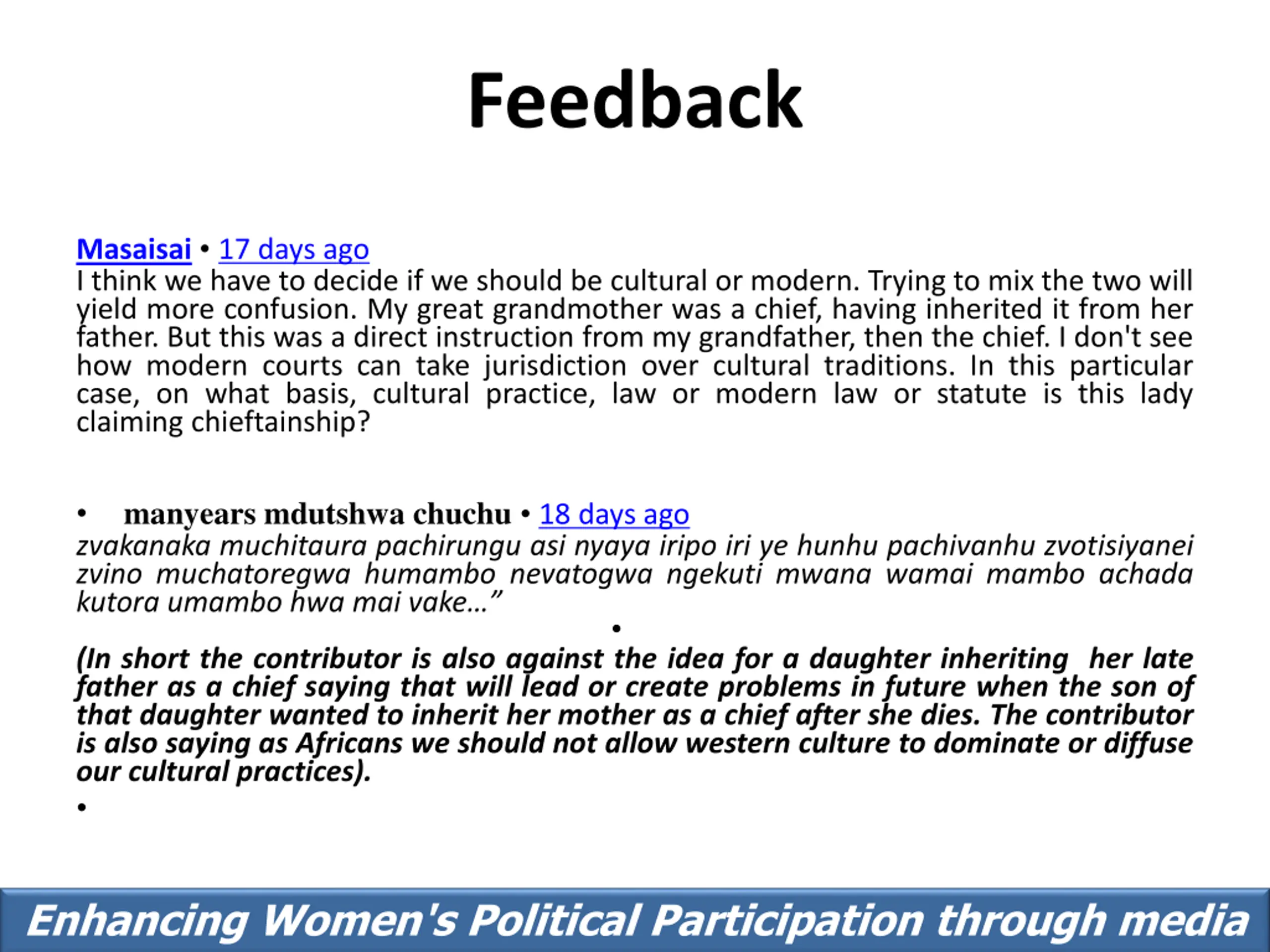Feedback Masaisai 17 days ago I think we have to decide if we should be cultural or modern. Trying to mix the two will yield more confusion. My great grandmother was a chief, having inherited it from her father. But this was a direct instruction from my grandfather, then the chief. I don't see how modern courts can take jurisdiction over cultural traditions. In this particular case, on what basis, cultural practice, law or modern law or statute is this lady claiming chieftainship? manyears mdutshwa chuchu 18 days ago zvakanaka muchitaura pachirungu asi nyaya iripo iri ye hunhu pachivanhu zvotisiyanei zvino muchatoregwa humambo nevatogwa ngekuti mwana wamai mambo achada kutora umambo hwa mai vake (In short the contributor is also against the idea for a daughter inheriting her late father as a chief saying that will lead or create problems in future when the son of that daughter wanted to inherit her mother as a chief after she dies. The contributor is also saying as Africans we should not allow western culture to dominate or diffuse our cultural practices). Enhancing Women's Political Participation through media