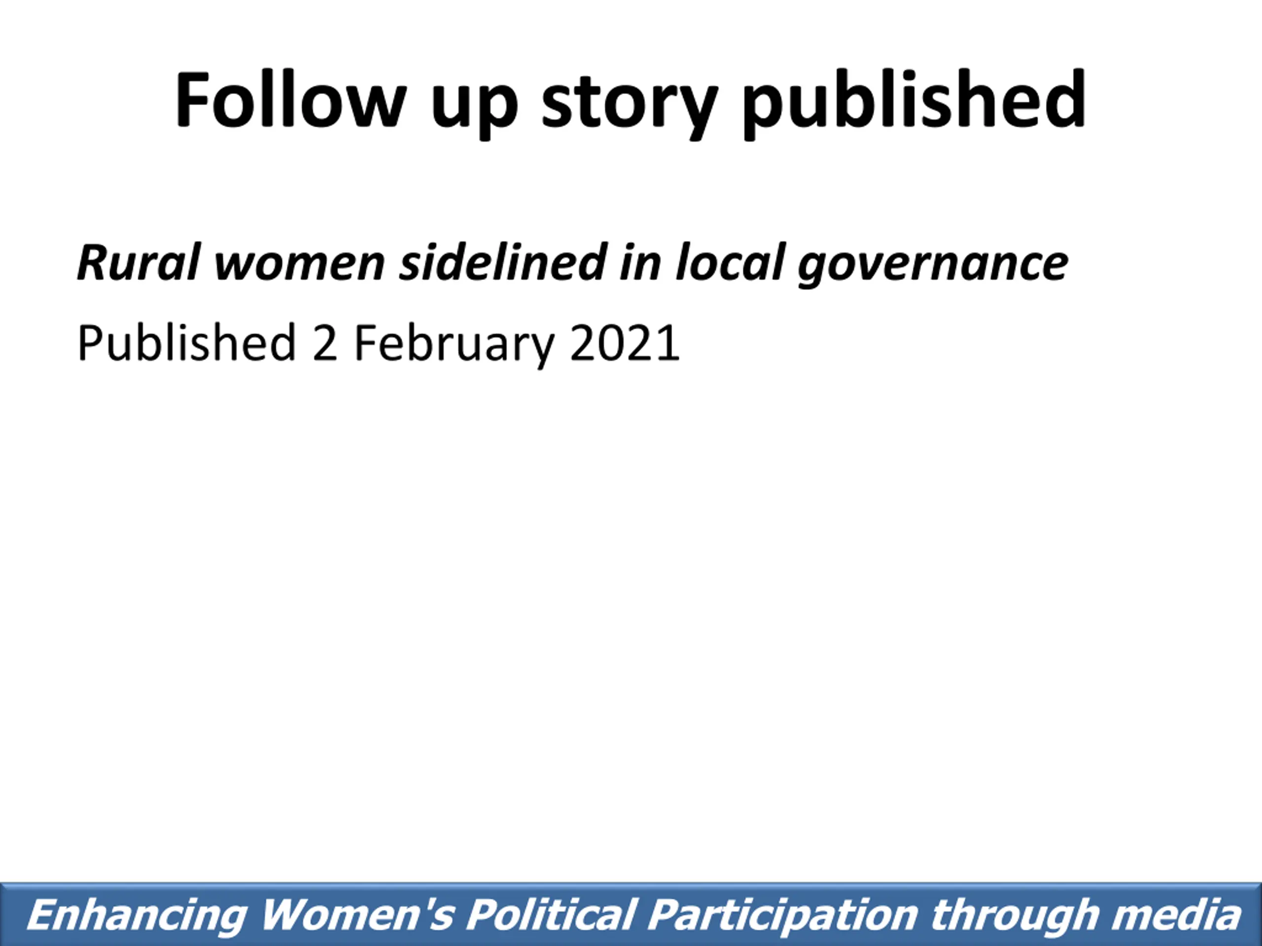 Follow up story published Rural women sidelined in local governance Published 2 February 2021 Enhancing Women's Political Participation through media