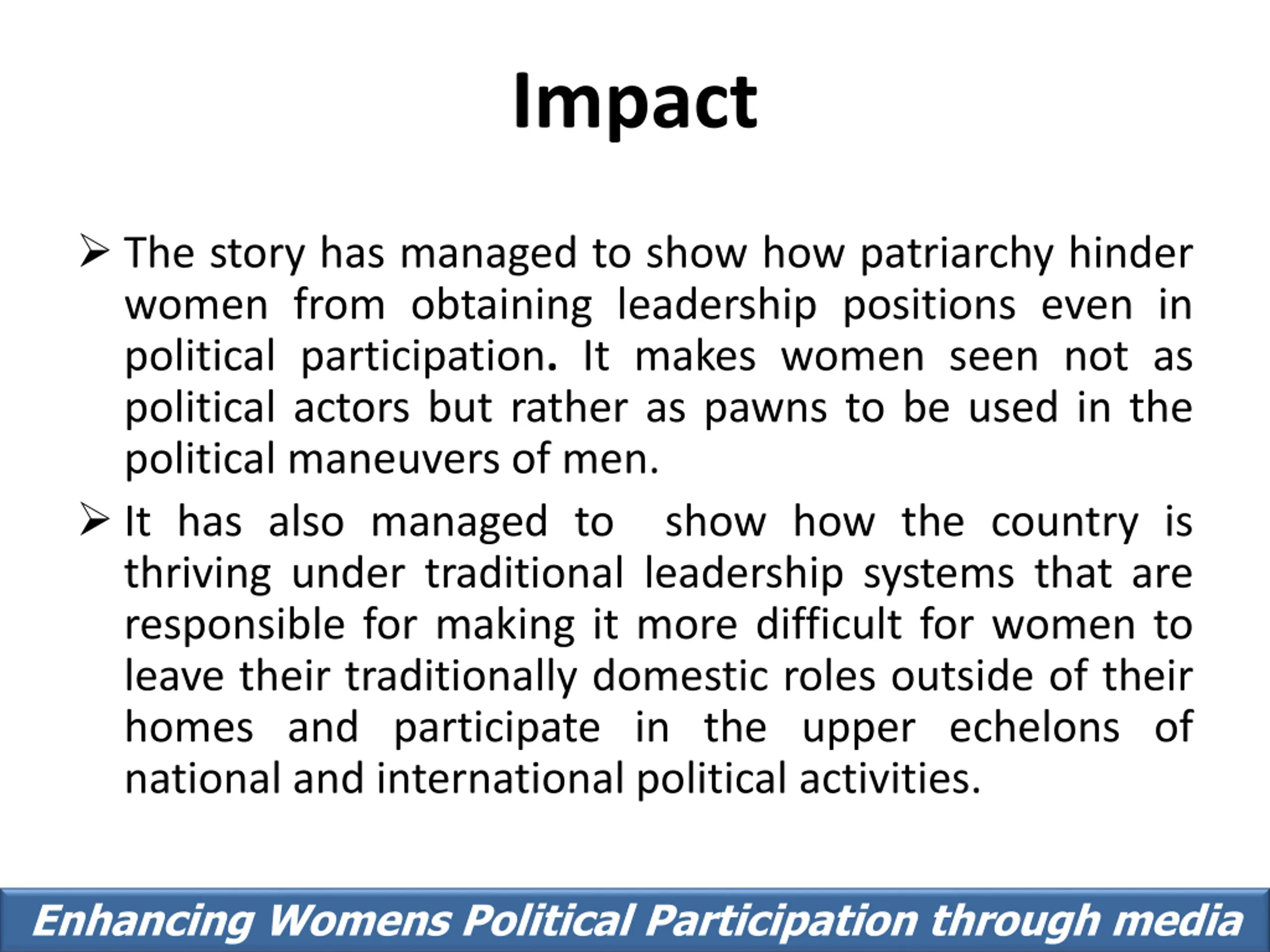 Impact The story has managed to show how patriarchy hinder women from obtaining leadership positions even in political participation. It makes women seen not as political actors but rather as pawns to be used in the political maneuvers of men. It has also managed to show how the country is thriving under traditional leadership systems that are responsible for making it more difficult for women to leave their traditionally domestic roles outside of their homes and participate in the upper echelons of national and international political activities. Enhancing Womens Political Participation through media