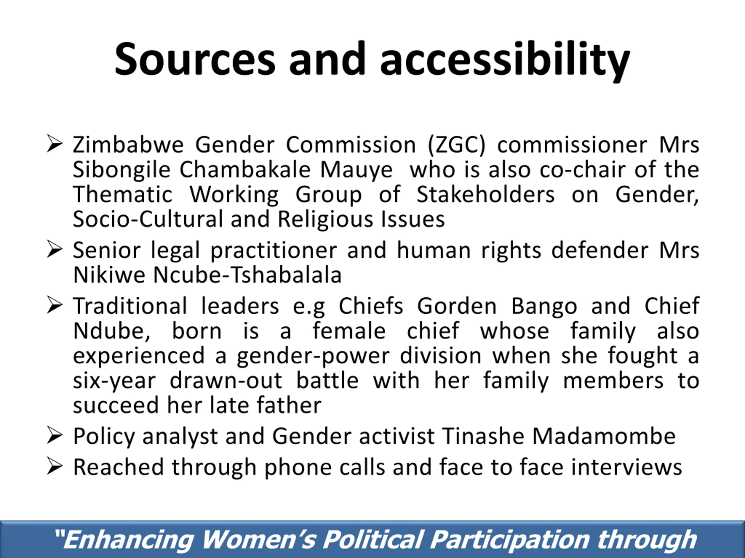 Sources and accessibility Zimbabwe Gender Commission (ZGC) commissioner Mrs Sibongile Chambakale Mauye who is also co-chair of the Thematic Working Group of Stakeholders on Gender, Socio-Cultural and Religious Issues Senior legal practitioner and human rights defender Mrs Nikiwe Ncube-Tshabalala Traditional leaders e.g Chiefs Gorden Bango and Chief Ndube, born is a female chief whose family also experienced a gender-power division when she fought a six-year drawn-out battle with her family members to succeed her late father Policy analyst and Gender activist Tinashe Madamombe Reached through phone calls and face to face interviews Enhancing Women s Political Participation through media