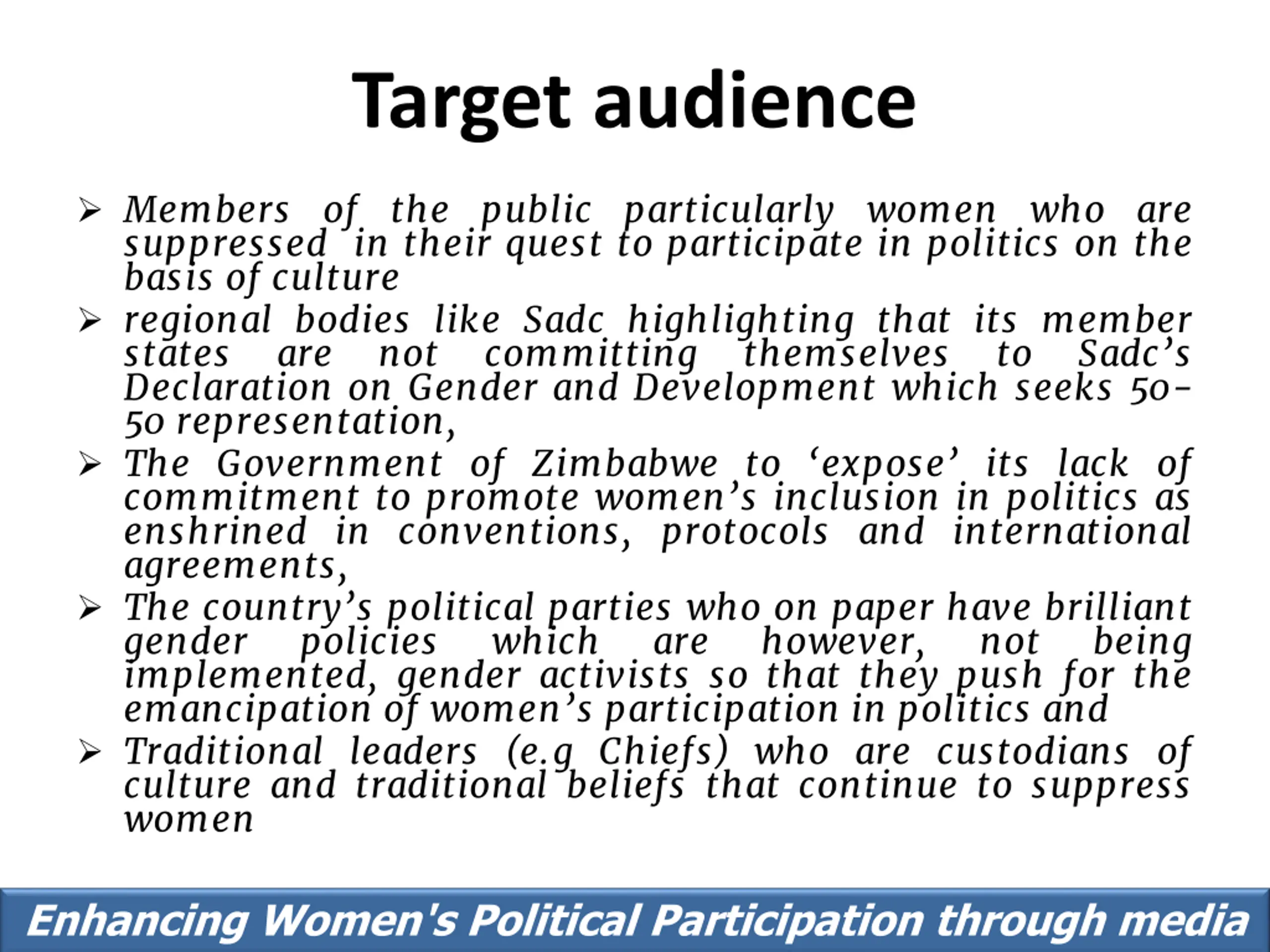 Target audience Members of the public particularly women who are suppressed in their quest to participate in politics on the basis of culture regional bodies like Sadc highlighting that its member states are not committing Declaration on Gender and Development which seeks 50- 50 representation, The Government of Zimbabwe to expose its lack of commitment to promote women s inclusion in politics as enshrined in conventions, protocols and international agreements, The country s political parties who on paper have brilliant gender policies which implemented, gender activists so that they push for the emancipation of women s participation in politics and Traditional leaders (e.g Chiefs) who are custodians of culture and traditional beliefs that continue to suppress women themselves to Sadc s are however, not being Enhancing Women's Political Participation through media