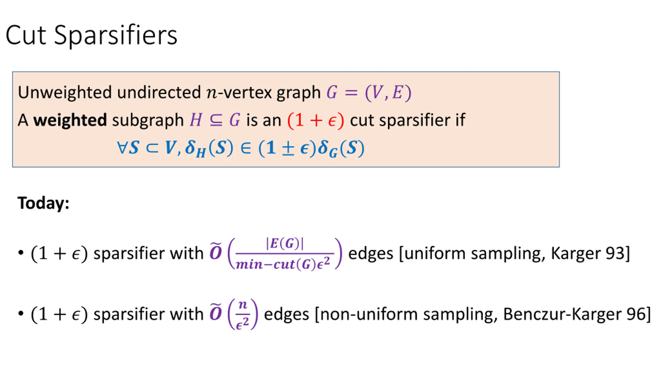 Cut Sparsifiers Unweighted undirected ?-vertex graph ? = (?,?) A weighted subgraph ? ? is an (1 + ?) cut sparsifier if ? ?,??? (? ?)??(?) Today: ? ? (1 + ?) sparsifier with ? ??? ??? ? ??edges [uniform sampling, Karger 93] ? ?? edges [non-uniform sampling, Benczur-Karger 96] (1 + ?) sparsifier with ?