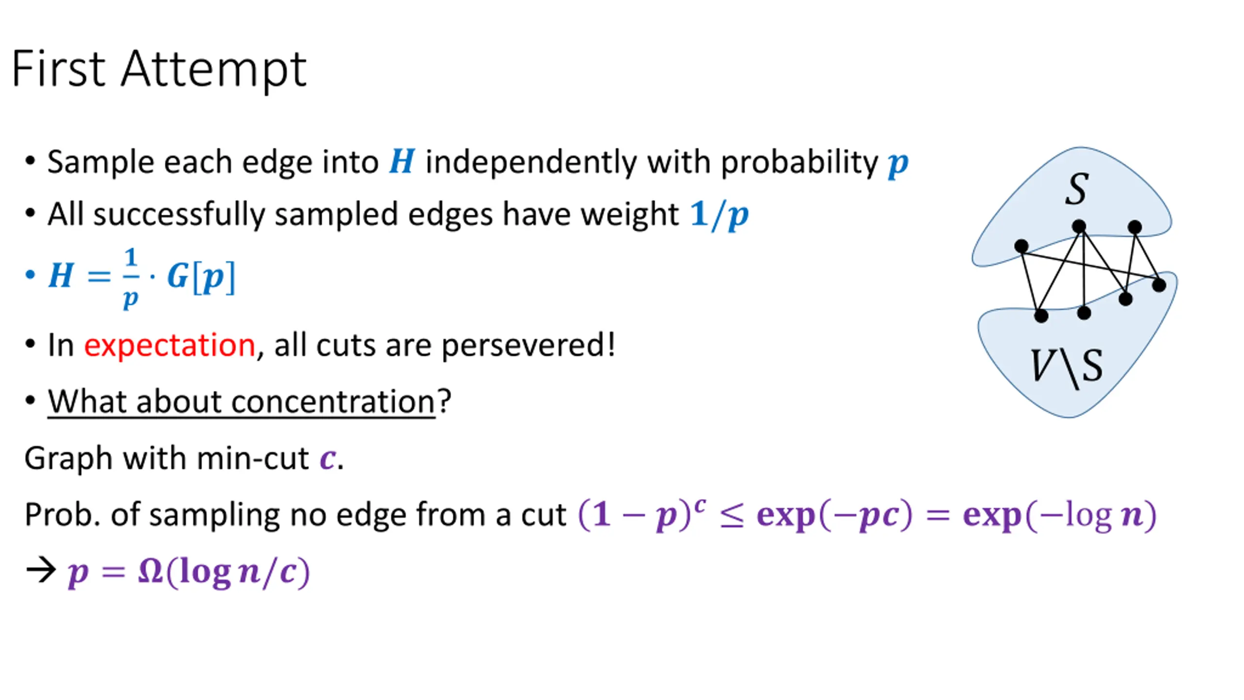 First Attempt Sample each edge into ? independently with probability ? All successfully sampled edges have weight ?/? ? =? ? ?[?] In expectation, all cuts are persevered! What about concentration? ? ?\S Graph with min-cut ?. Prob. of sampling no edge from a cut ? ?? ??? ?? = ???( log ?) ? = ?(????/?)