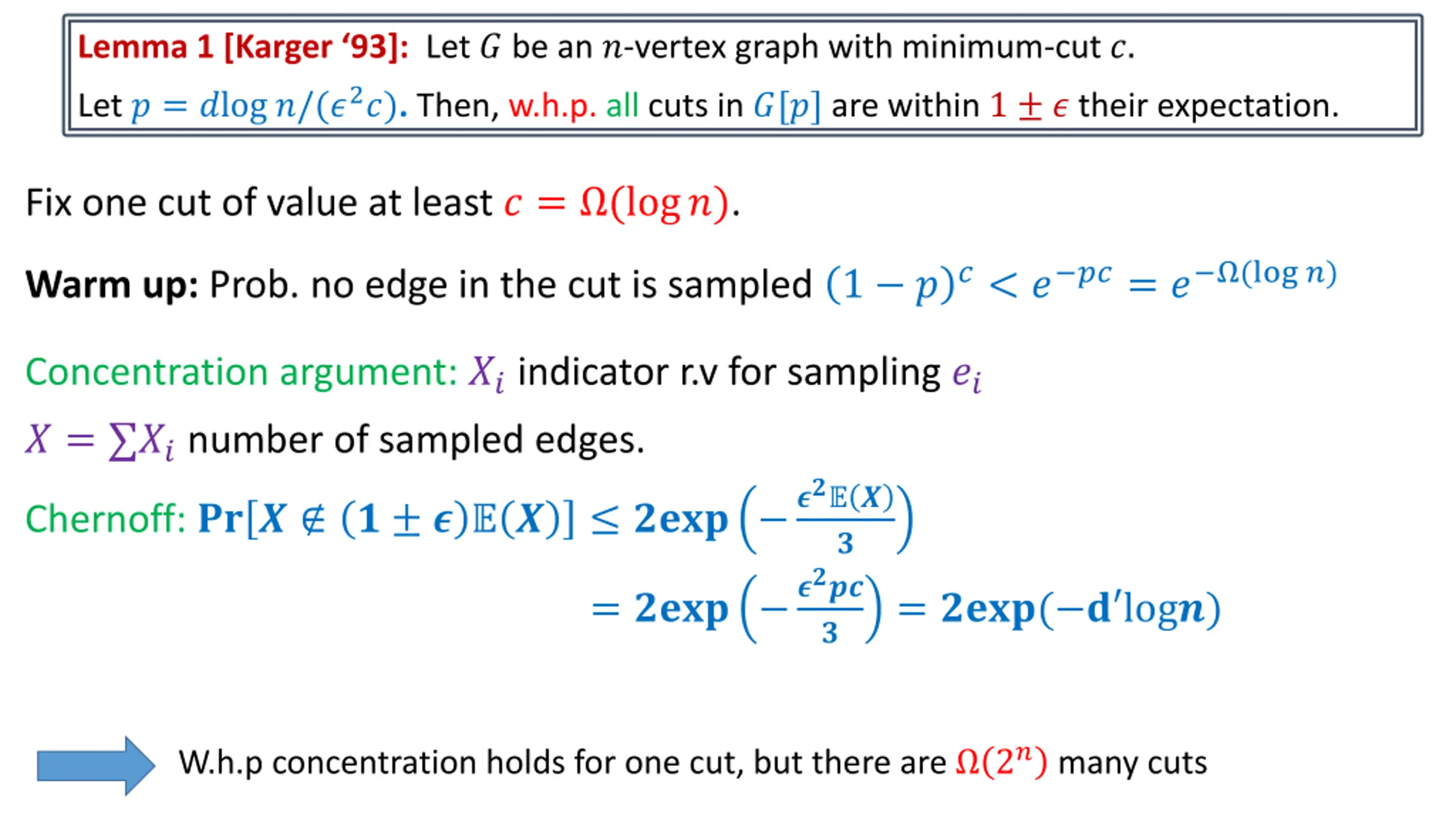 Lemma 1 [Karger 93]: Let ?be an ?-vertex graph with minimum-cut ?. Let ? = ?log ?/(?2?). Then, w.h.p. all cuts in ?[?]are within 1 ? their expectation. Fix one cut of value at least ? = (log?). Warm up: Prob. no edge in the cut is sampled 1 ??< ? ??= ? (log ?) Concentration argument: ?? indicator r.v for sampling ?? ? = ?? number of sampled edges. ???? ??? ? Chernoff: ?? ? ? ? ? ? ? = ???? ???? = ????( ? log?) ? W.h.p concentration holds for one cut, but there are 2? many cuts