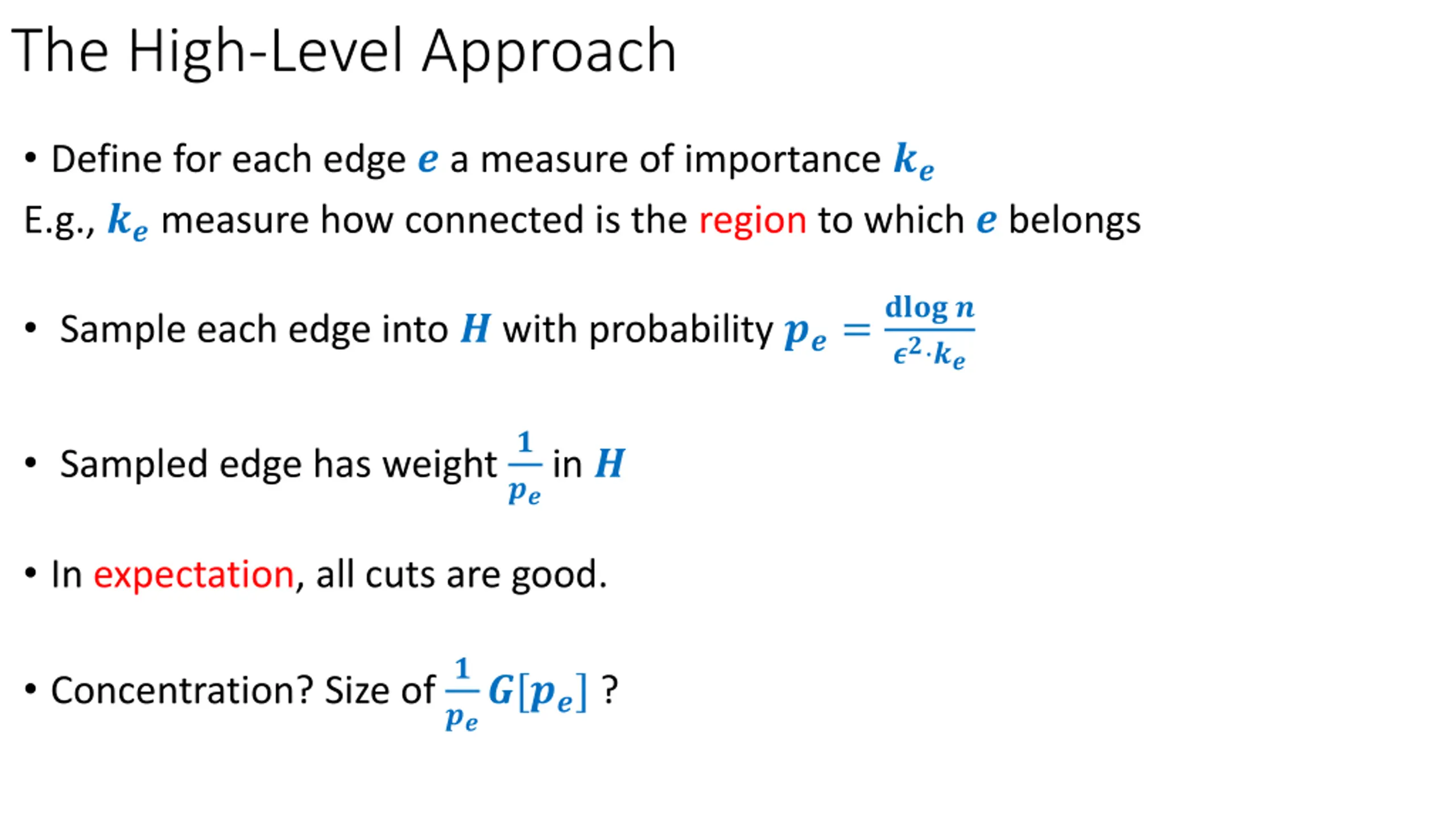 The High-Level Approach Define for each edge ? a measure of importance ?? E.g., ?? measure how connected is the region to which ? belongs Sample each edge into ? with probability ??=???? ? ?? ?? Sampled edge has weight ? ??in? In expectation, all cuts are good. Concentration? Size of ? ???[??]?