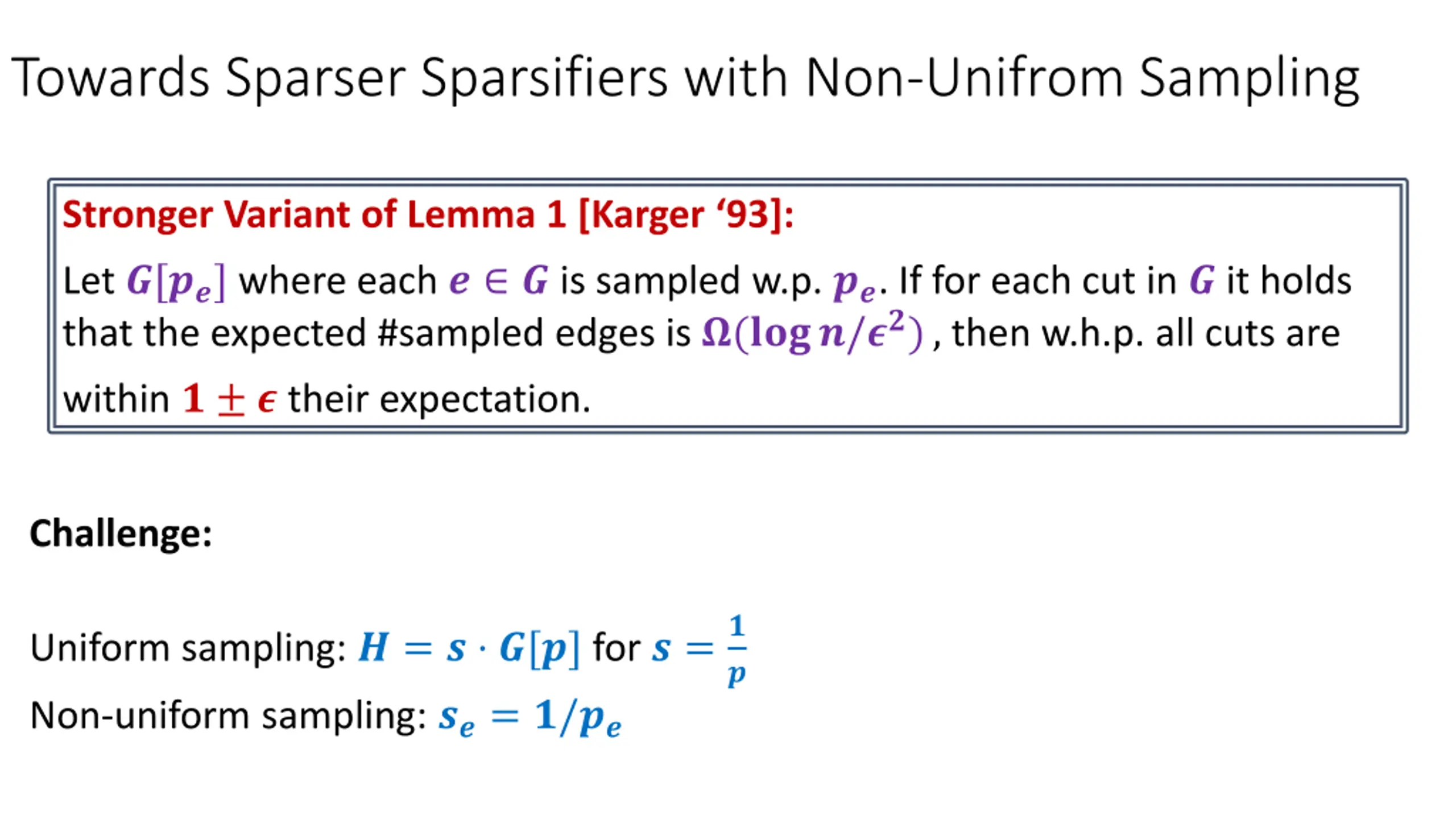 Towards Sparser Sparsifiers with Non-Unifrom Sampling Stronger Variant of Lemma 1 [Karger 93]: Let ?[??]where each ? ?is sampled w.p. ??. If for each cut in ? it holds that the expected #sampled edges is ?(????/??), then w.h.p. all cuts are within ? ?their expectation. Challenge: Uniform sampling: ? = ? ?[?]for ? =? ? Non-uniform sampling: ??= ?/??