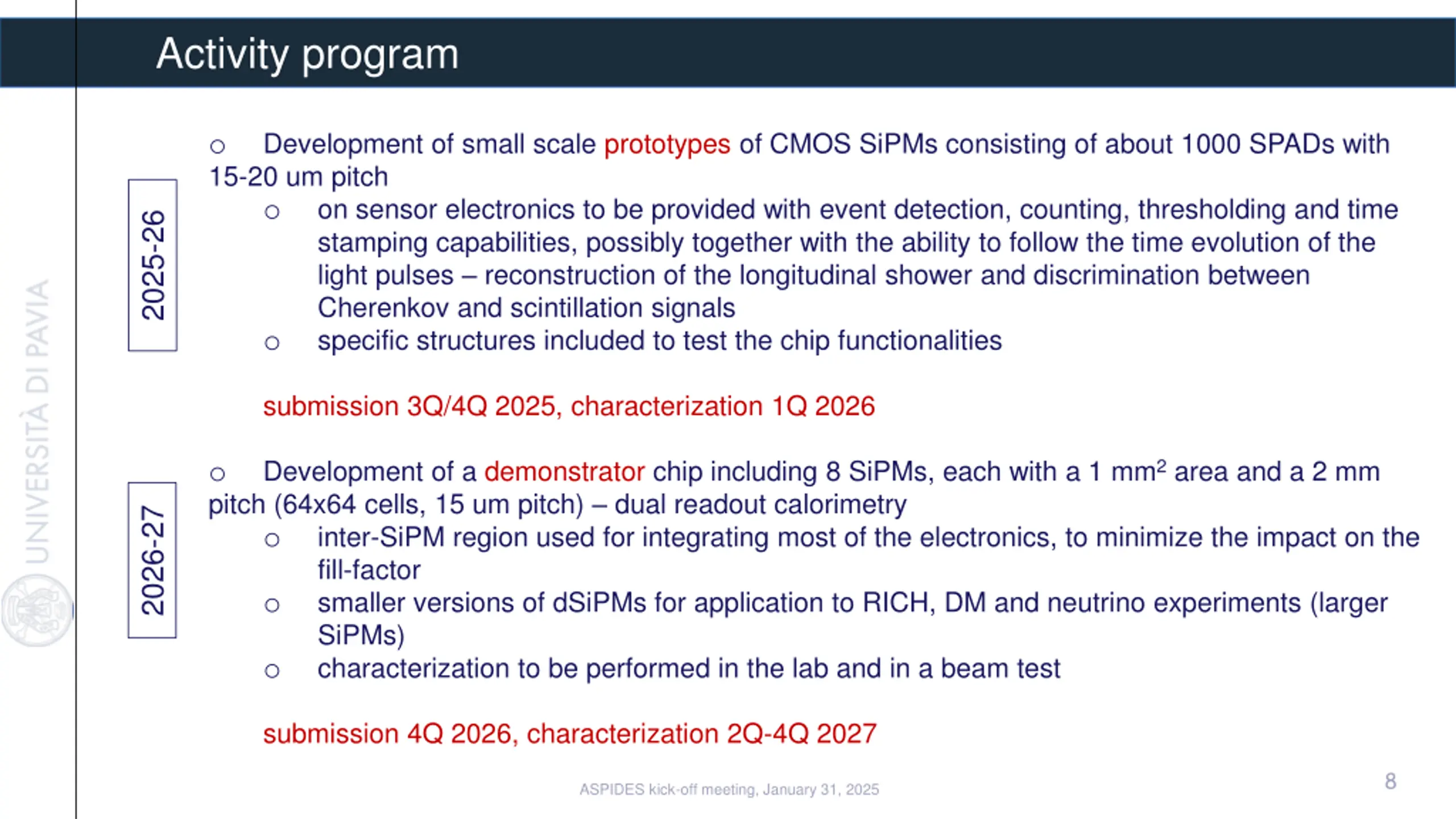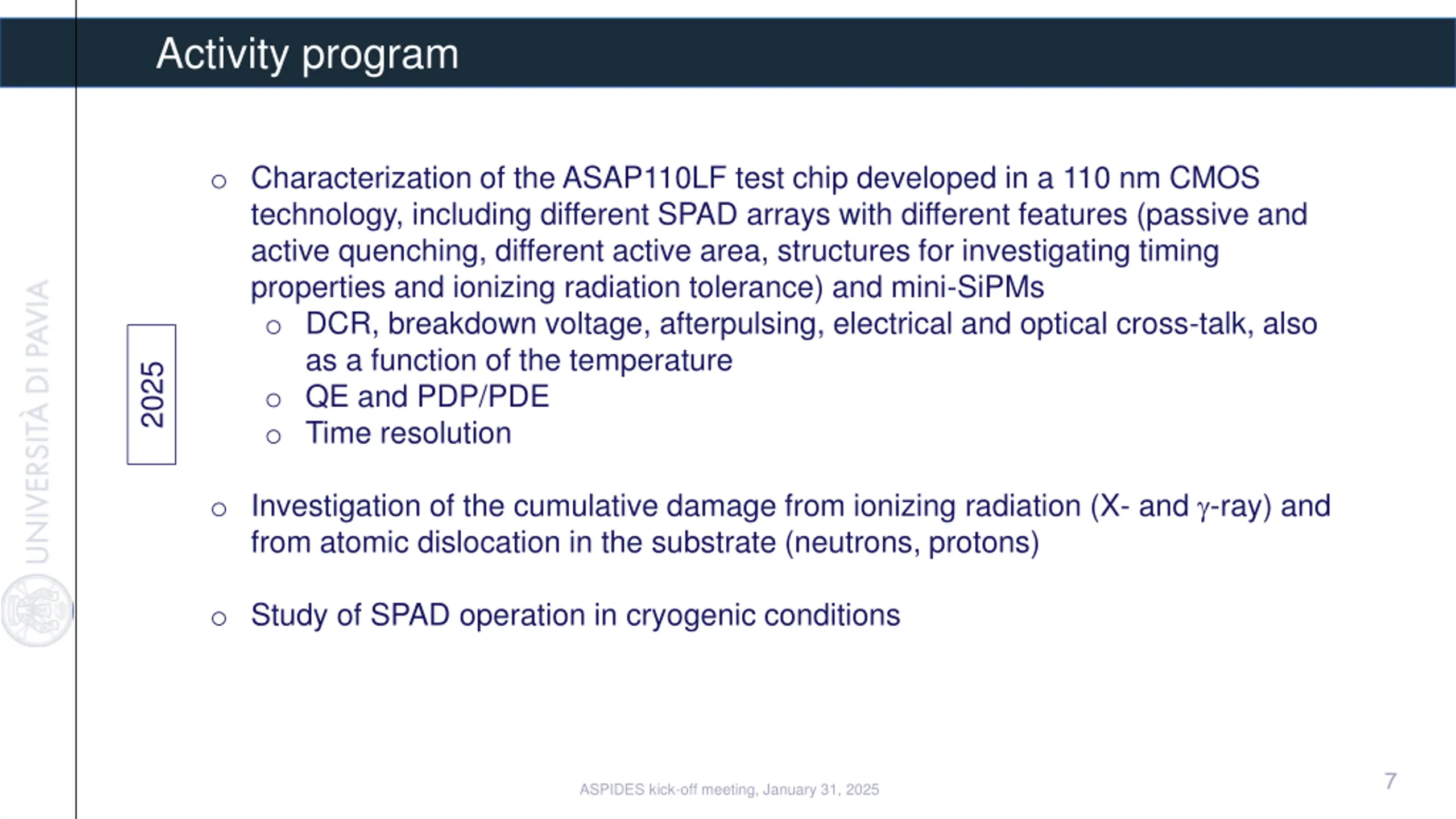 Activity program o Characterization of the ASAP110LF test chip developed in a 110 nm CMOS technology, including different SPAD arrays with different features (passive and active quenching, different active area, structures for investigating timing properties and ionizing radiation tolerance) and mini-SiPMs o DCR, breakdown voltage, afterpulsing, electrical and optical cross-talk, also as a function of the temperature o QE and PDP/PDE o Time resolution 2025 o Investigation of the cumulative damage from ionizing radiation (X- and -ray) and from atomic dislocation in the substrate (neutrons, protons) o Study of SPAD operation in cryogenic conditions 7 ASPIDES kick-off meeting, January 31, 2025