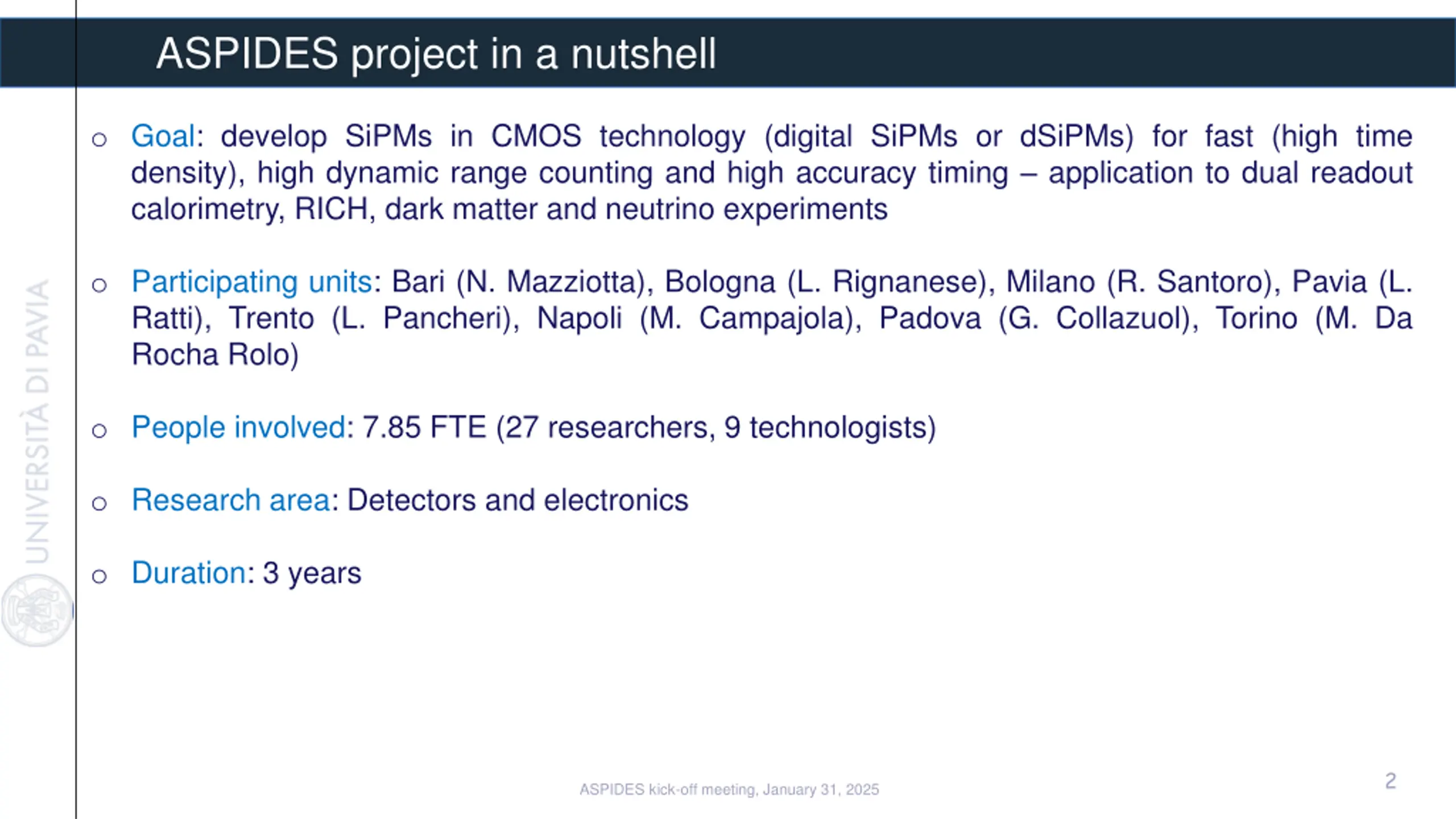 ASPIDES project in a nutshell o Goal: develop SiPMs in CMOS technology (digital SiPMs or dSiPMs) for fast (high time density), high dynamic range counting and high accuracy timing application to dual readout calorimetry, RICH, dark matter and neutrino experiments o Participating units: Bari (N. Mazziotta), Bologna (L. Rignanese), Milano (R. Santoro), Pavia (L. Ratti), Trento (L. Pancheri), Napoli (M. Campajola), Padova (G. Collazuol), Torino (M. Da Rocha Rolo) o People involved: 7.85 FTE (27 researchers, 9 technologists) o Research area: Detectors and electronics o Duration: 3 years 2 ASPIDES kick-off meeting, January 31, 2025