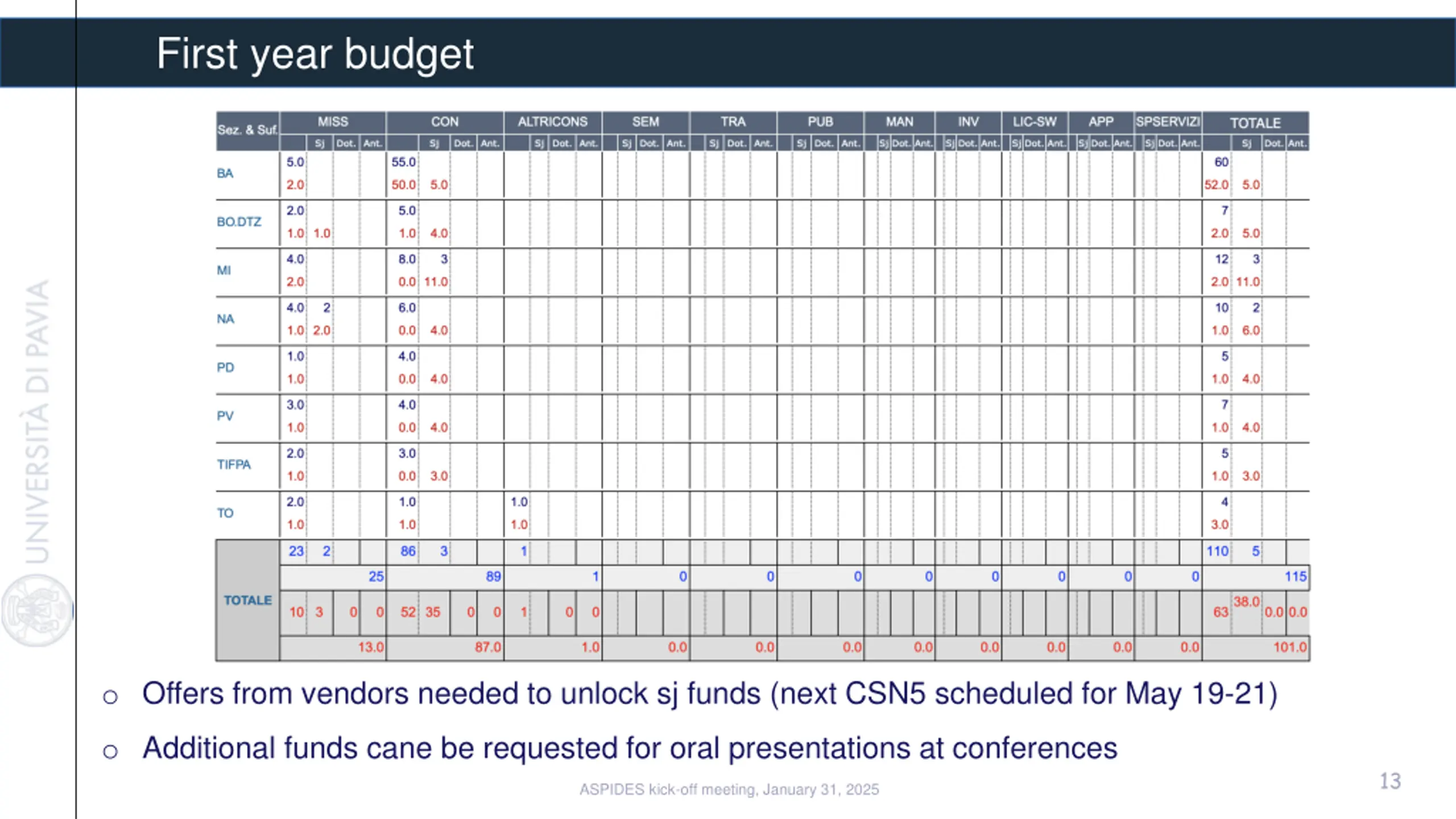 First year budget o Offers from vendors needed to unlock sj funds (next CSN5 scheduled for May 19-21) o Additional funds cane be requested for oral presentations at conferences 13 ASPIDES kick-off meeting, January 31, 2025