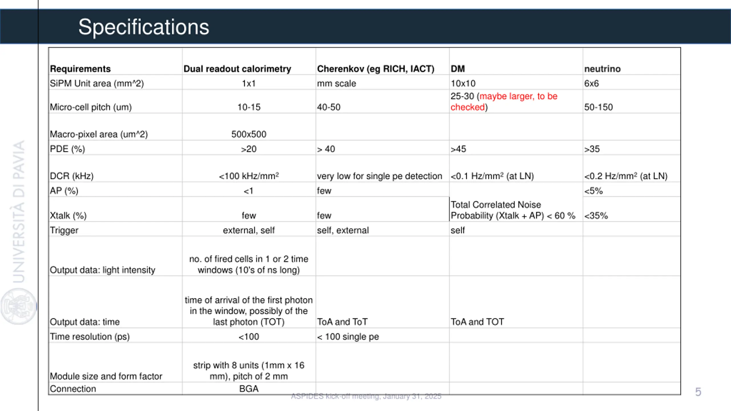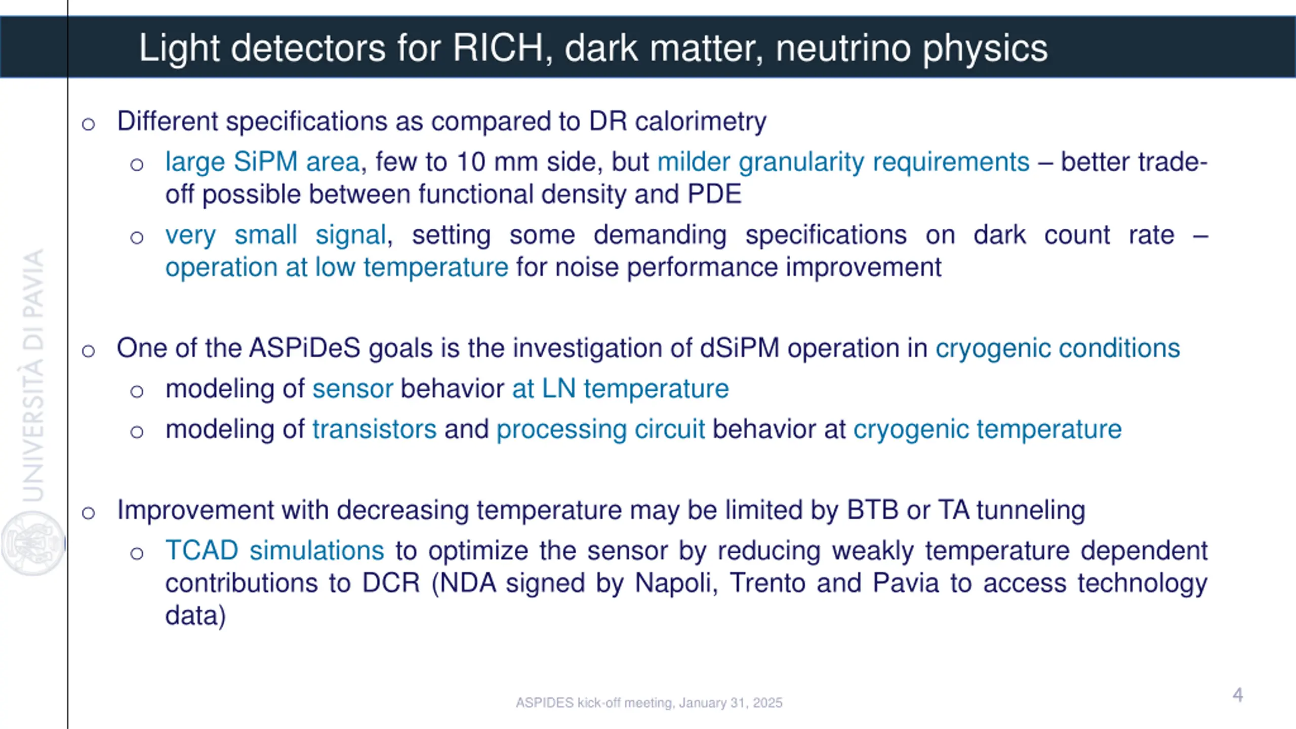 Light detectors for RICH, dark matter, neutrino physics o Different specifications as compared to DR calorimetry o large SiPM area, few to 10 mm side, but milder granularity requirements better trade- off possible between functional density and PDE o very small signal, setting some demanding specifications on dark count rate operation at low temperature for noise performance improvement o One of the ASPiDeS goals is the investigation of dSiPM operation in cryogenic conditions o modeling of sensor behavior at LN temperature o modeling of transistors and processing circuit behavior at cryogenic temperature o Improvement with decreasing temperature may be limited by BTB or TA tunneling o TCAD simulations to optimize the sensor by reducing weakly temperature dependent contributions to DCR (NDA signed by Napoli, Trento and Pavia to access technology data) 4 ASPIDES kick-off meeting, January 31, 2025