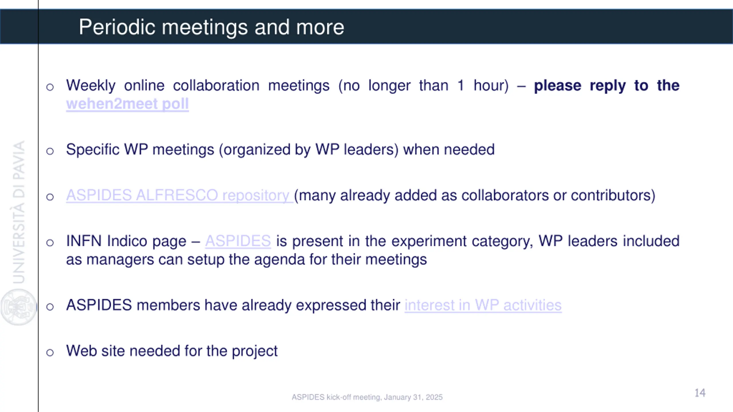Periodic meetings and more o Weekly online collaboration meetings (no longer than 1 hour) please reply to the wehen2meet poll o Specific WP meetings (organized by WP leaders) when needed o ASPIDES ALFRESCO repository (many already added as collaborators or contributors) o INFN Indico page ASPIDES is present in the experiment category, WP leaders included as managers can setup the agenda for their meetings o ASPIDES members have already expressed their interest in WP activities o Web site needed for the project 14 ASPIDES kick-off meeting, January 31, 2025