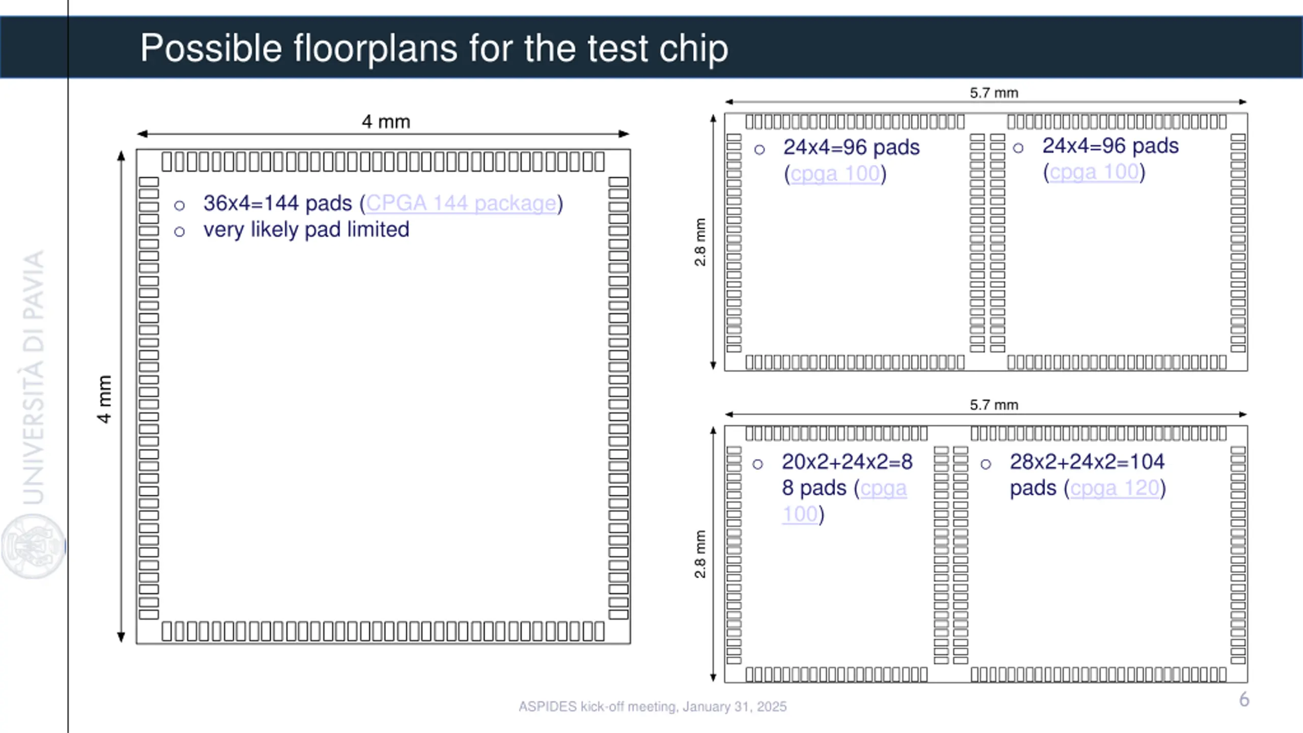 Possible floorplans for the test chip o 24x4=96 pads (cpga 100) o 24x4=96 pads (cpga 100) o 36x4=144 pads (CPGA 144 package) o very likely pad limited o 20x2+24x2=8 8 pads (cpga 100) o 28x2+24x2=104 pads (cpga 120) 6 ASPIDES kick-off meeting, January 31, 2025