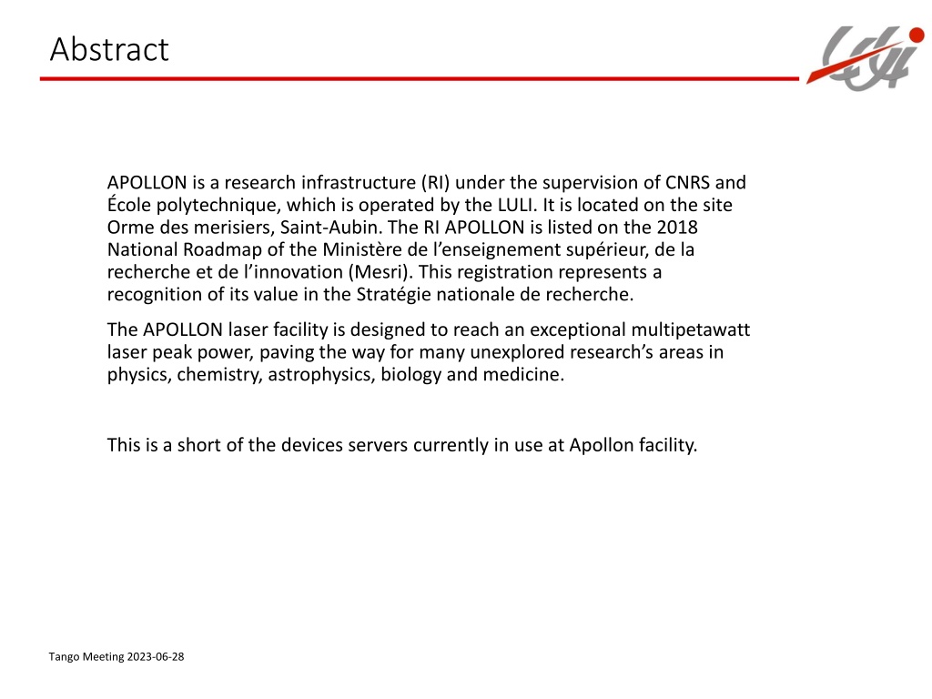 Abstract APOLLON is a research infrastructure (RI) under the supervision of CNRS and cole polytechnique, which is operated by the LULI. It is located on the site Orme des merisiers, Saint-Aubin. The RI APOLLON is listed on the 2018 National Roadmap of the Minist re de l enseignement sup rieur, de la recherche et de l innovation (Mesri). This registration represents a recognition of its value in the Strat gie nationale de recherche. The APOLLON laser facility is designed to reach an exceptional multipetawatt laser peak power, paving the way for many unexplored research s areas in physics, chemistry, astrophysics, biology and medicine. This is a short of the devices servers currently in use at Apollon facility. Tango Meeting 2023-06-28
