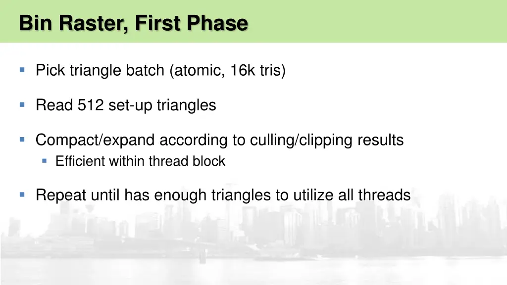 Bin Raster, First Phase Pick triangle batch (atomic, 16k tris) Read 512 set-up triangles Compact/expand according to culling/clipping results Efficient within thread block Repeat until has enough triangles to utilize all threads