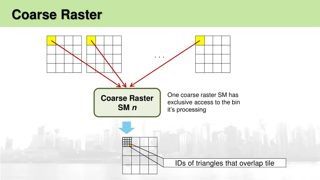 Coarse Raster . . . One coarse raster SM has exclusive access to the bin it s processing Coarse Raster SM n IDs of triangles that overlap tile