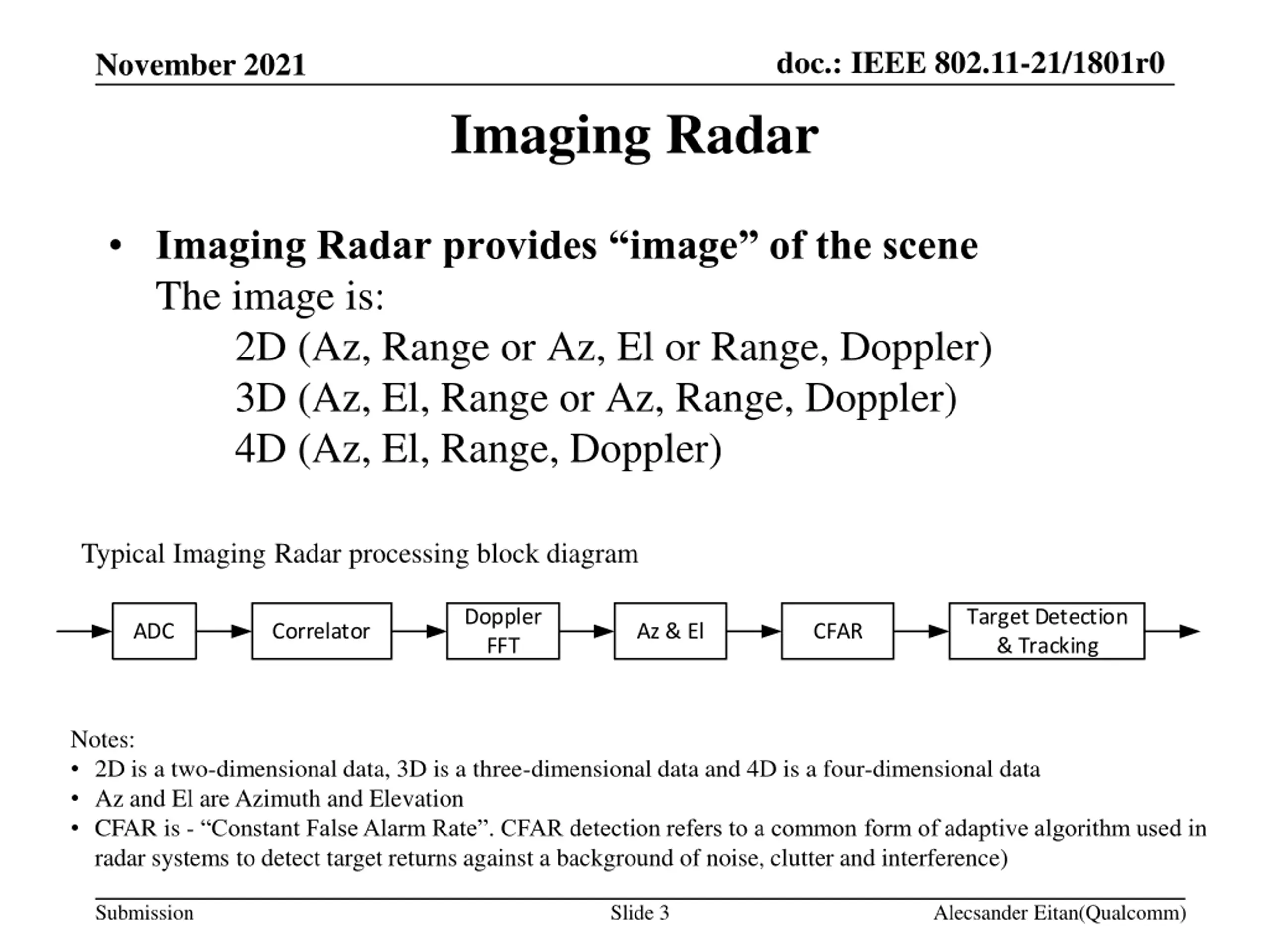 doc.: IEEE 802.11-21/1801r0 November 2021 Agenda This presentation introduces the Imaging Radar We present the typical processing of an Imaging Radar Discuss the report options and evaluate them Submission Slide 2 Alecsander Eitan(Qualcomm))
