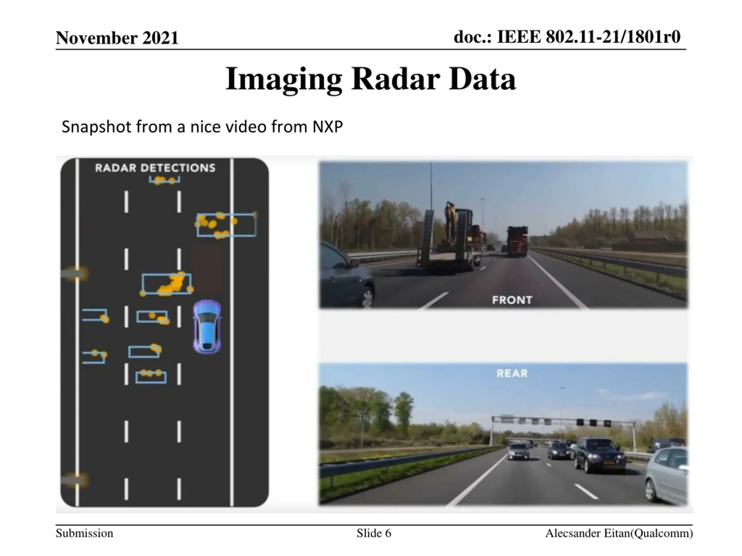 doc.: IEEE 802.11-21/1801r0 November 2021 Imaging Radar Data Snapshot from a nice video from NXP Submission Slide 6 Alecsander Eitan(Qualcomm)
