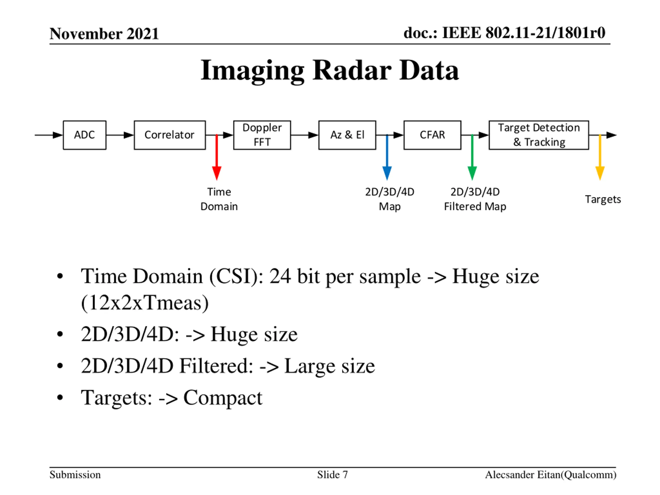 doc.: IEEE 802.11-21/1801r0 November 2021 Imaging Radar Data Doppler FFT Target Detection & Tracking ADC Correlator Az & El CFAR Time Domain 2D/3D/4D Map 2D/3D/4D Filtered Map Targets Time Domain (CSI): 24 bit per sample -> Huge size (12x2xTmeas) 2D/3D/4D: -> Huge size 2D/3D/4D Filtered: -> Large size Targets: -> Compact Submission Slide 7 Alecsander Eitan(Qualcomm)