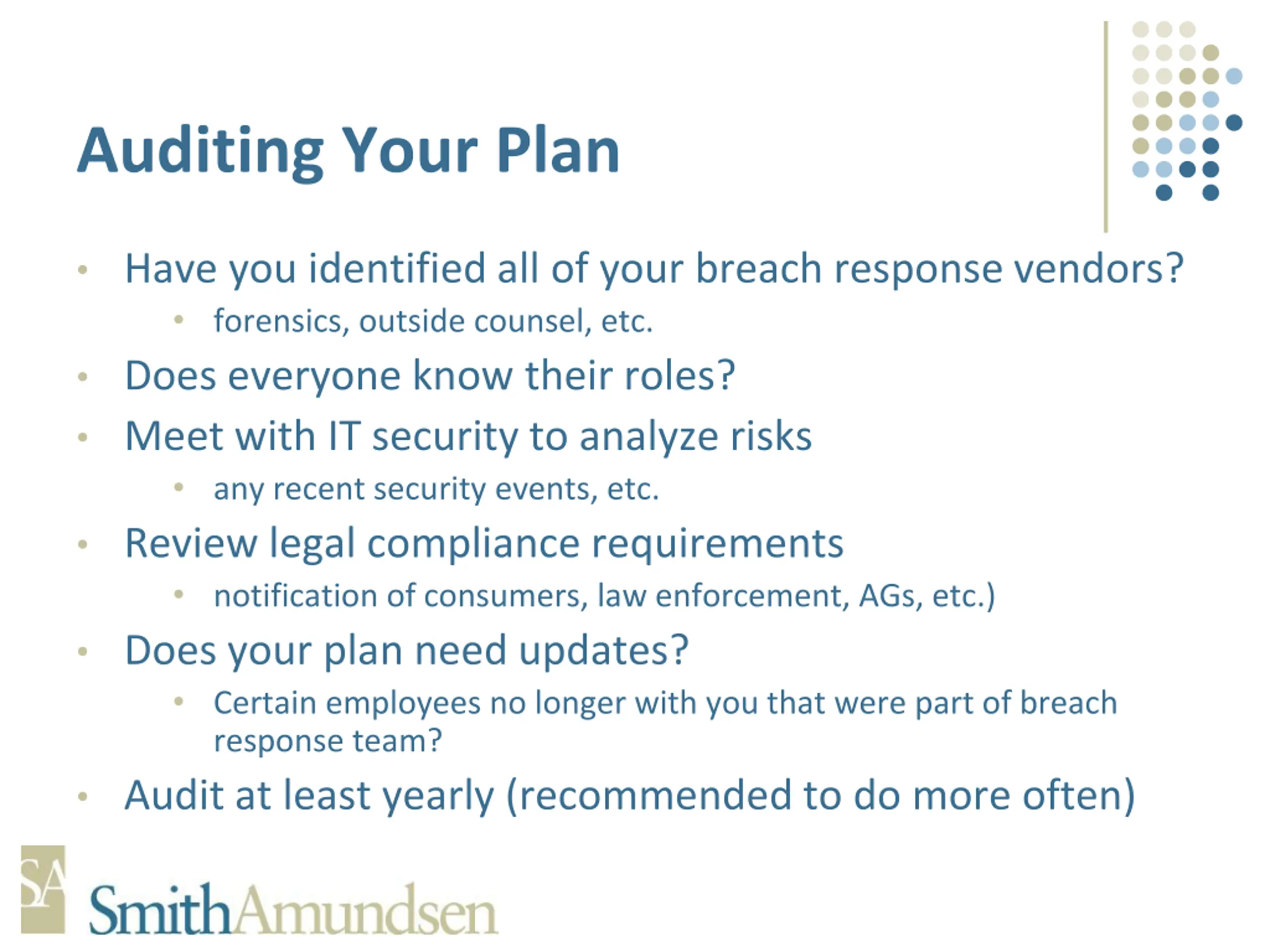 Auditing Your Plan Have you identified all of your breach response vendors? forensics, outside counsel, etc. Does everyone know their roles? Meet with IT security to analyze risks any recent security events, etc. Review legal compliance requirements notification of consumers, law enforcement, AGs, etc.) Does your plan need updates? Certain employees no longer with you that were part of breach response team? Audit at least yearly (recommended to do more often)