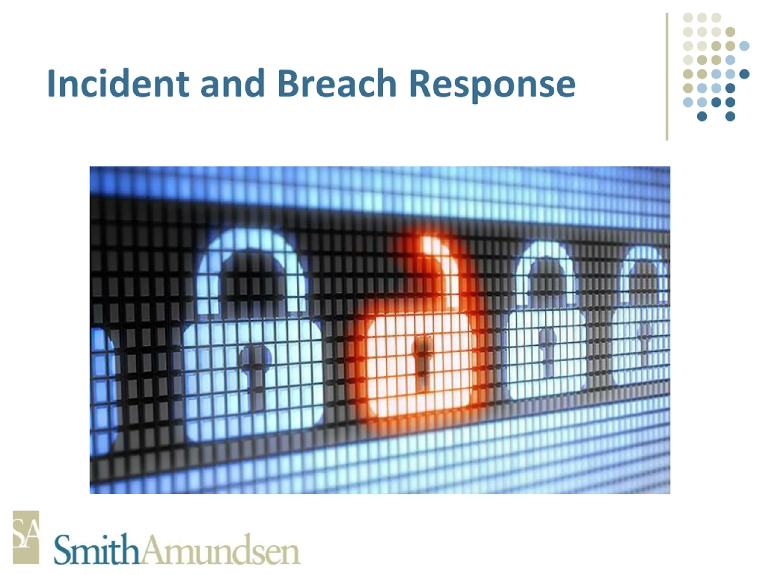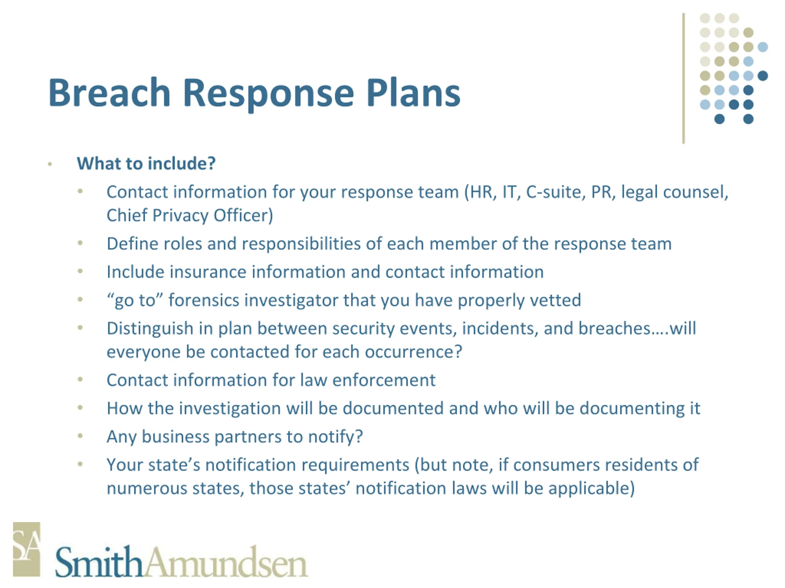 Breach Response Plans What to include? Contact information for your response team (HR, IT, C-suite, PR, legal counsel, Chief Privacy Officer) Define roles and responsibilities of each member of the response team Include insurance information and contact information go to forensics investigator that you have properly vetted Distinguish in plan between security events, incidents, and breaches .will everyone be contacted for each occurrence? Contact information for law enforcement How the investigation will be documented and who will be documenting it Any business partners to notify? Your state s notification requirements (but note, if consumers residents of numerous states, those states notification laws will be applicable)