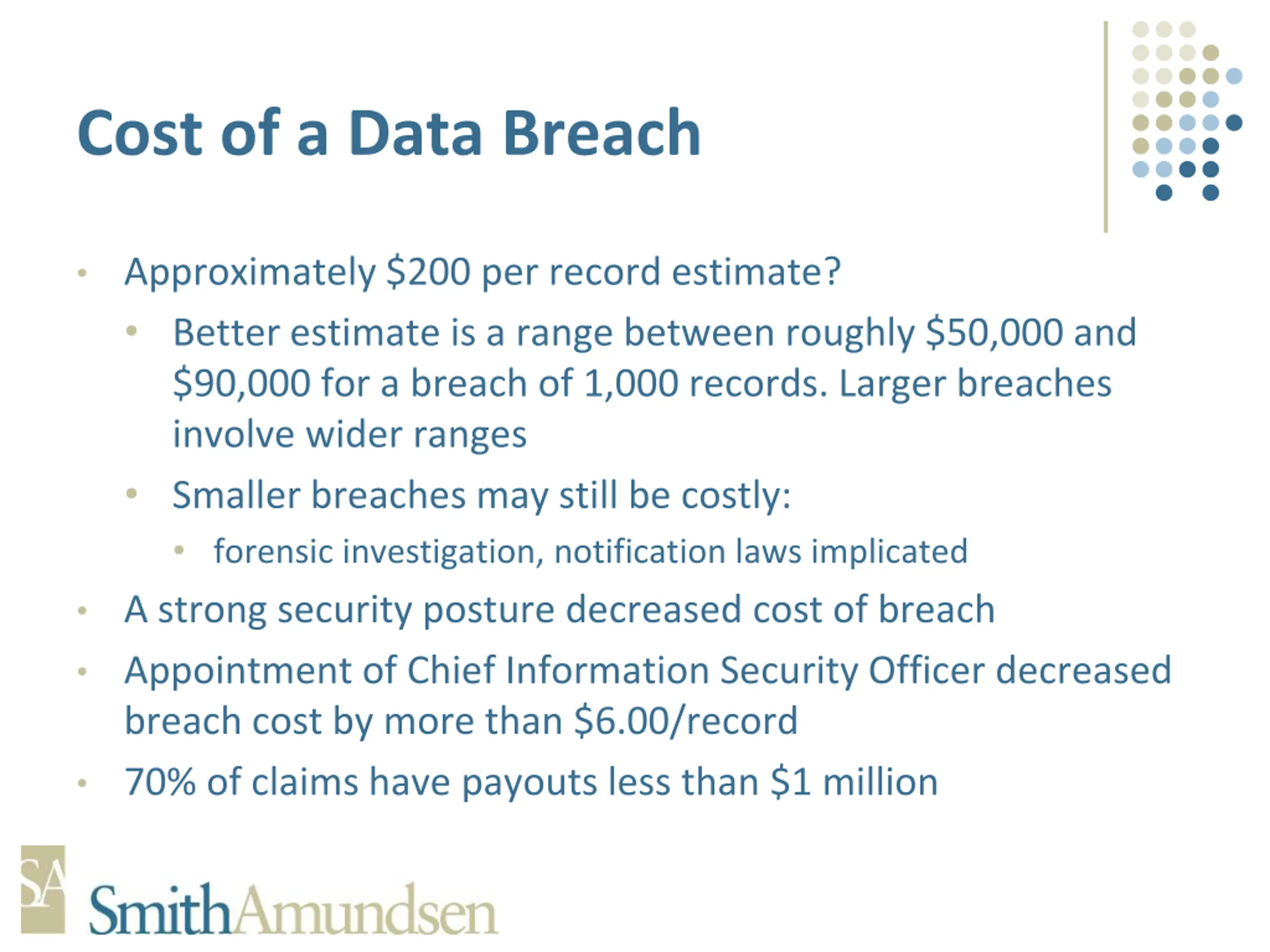 Cost of a Data Breach Approximately $200 per record estimate? Better estimate is a range between roughly $50,000 and $90,000 for a breach of 1,000 records. Larger breaches involve wider ranges Smaller breaches may still be costly: forensic investigation, notification laws implicated A strong security posture decreased cost of breach Appointment of Chief Information Security Officer decreased breach cost by more than $6.00/record 70% of claims have payouts less than $1 million