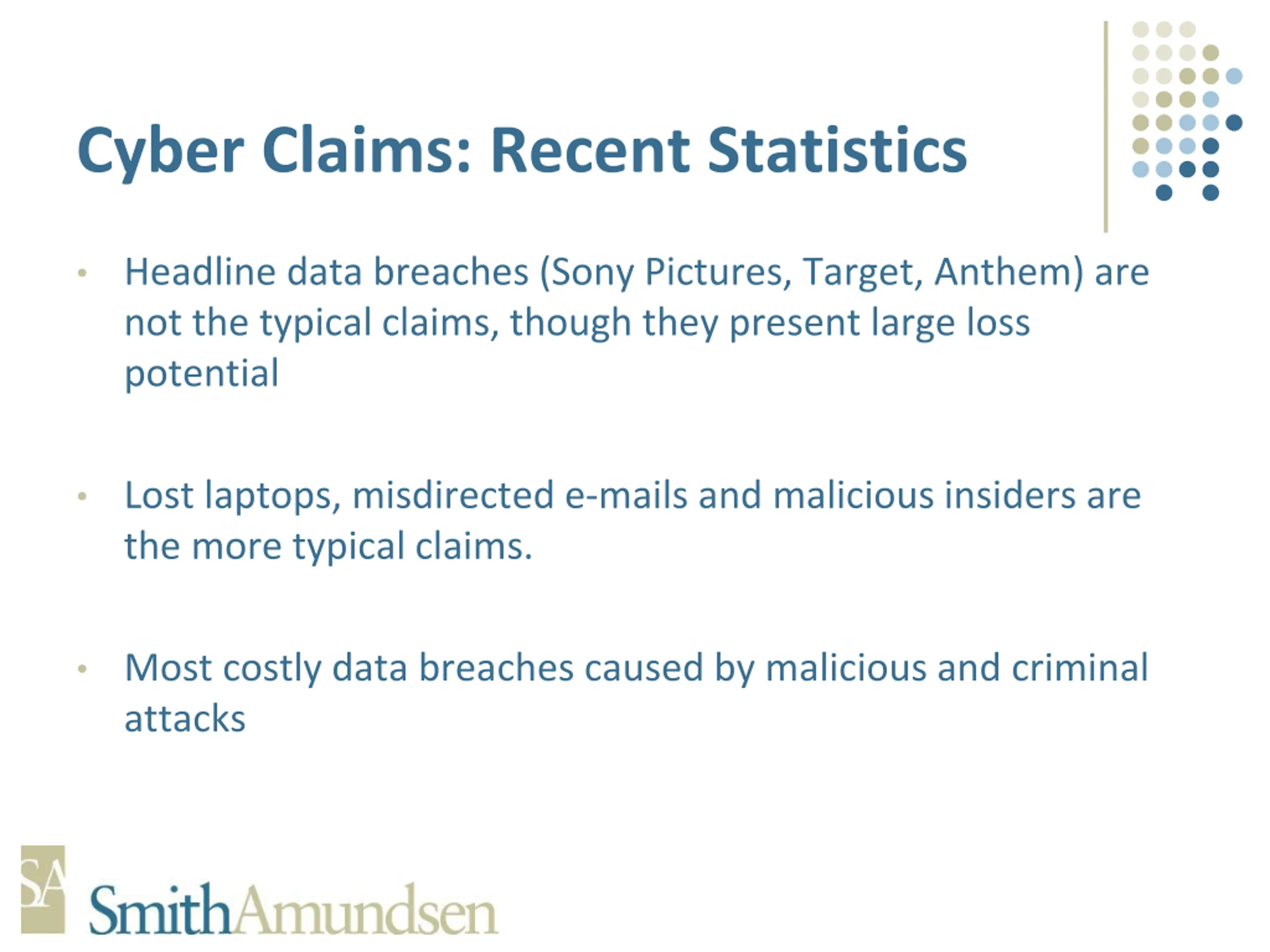 Cyber Claims: Recent Statistics Headline data breaches (Sony Pictures, Target, Anthem) are not the typical claims, though they present large loss potential Lost laptops, misdirected e-mails and malicious insiders are the more typical claims. Most costly data breaches caused by malicious and criminal attacks