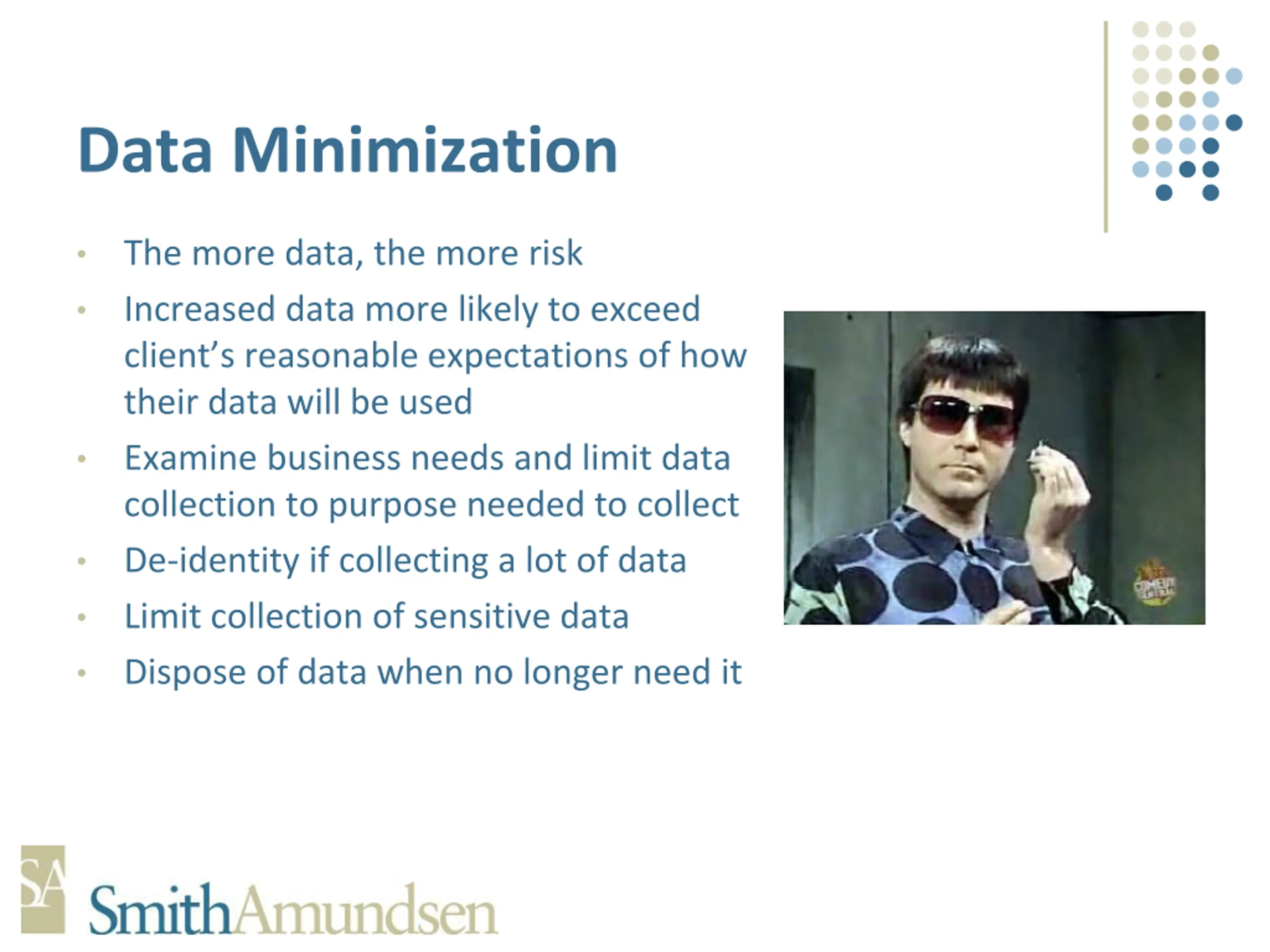 Data Minimization The more data, the more risk Increased data more likely to exceed client s reasonable expectations of how their data will be used Examine business needs and limit data collection to purpose needed to collect De-identity if collecting a lot of data Limit collection of sensitive data Dispose of data when no longer need it