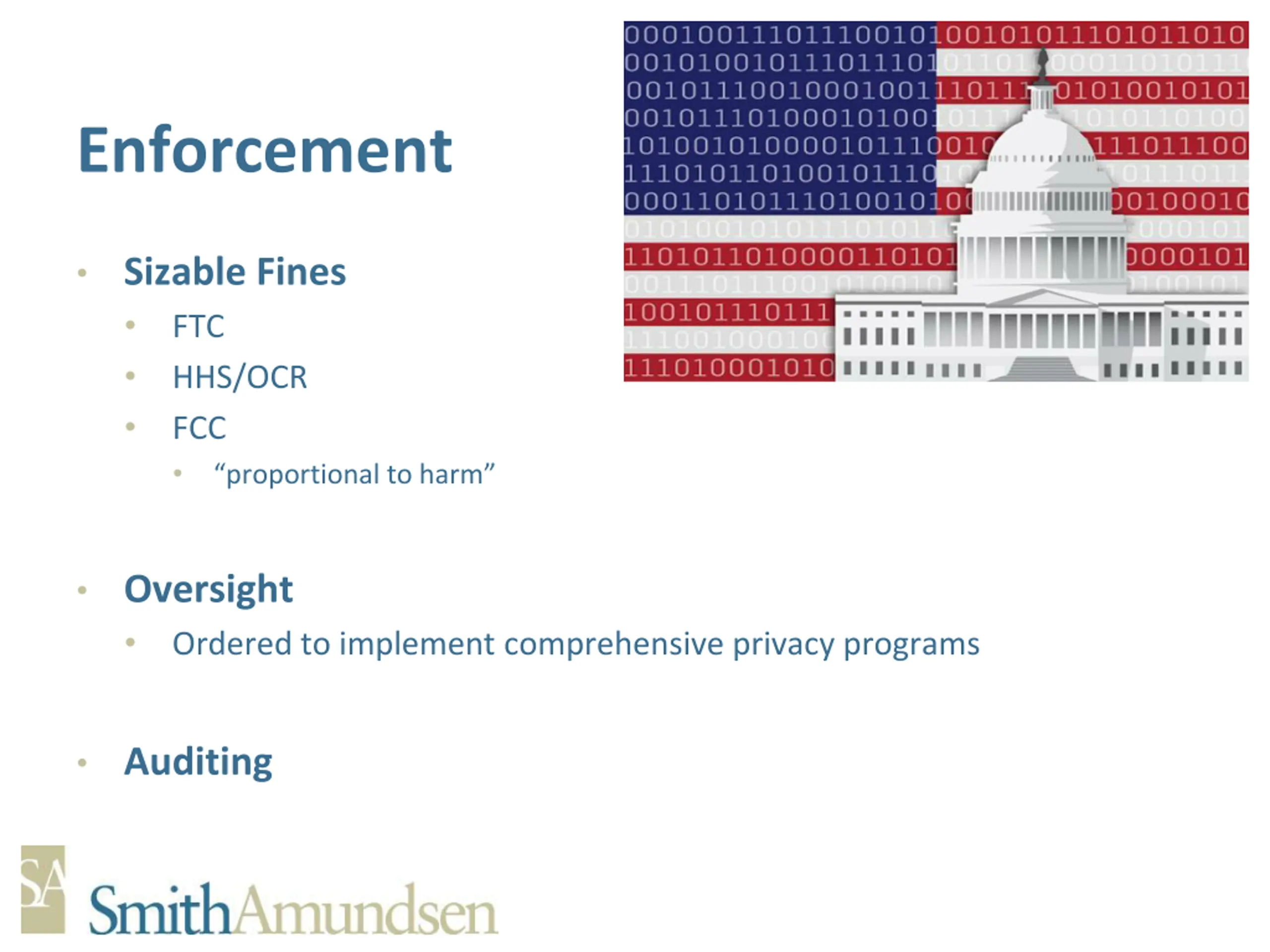 Enforcement Sizable Fines FTC HHS/OCR FCC proportional to harm Oversight Ordered to implement comprehensive privacy programs Auditing