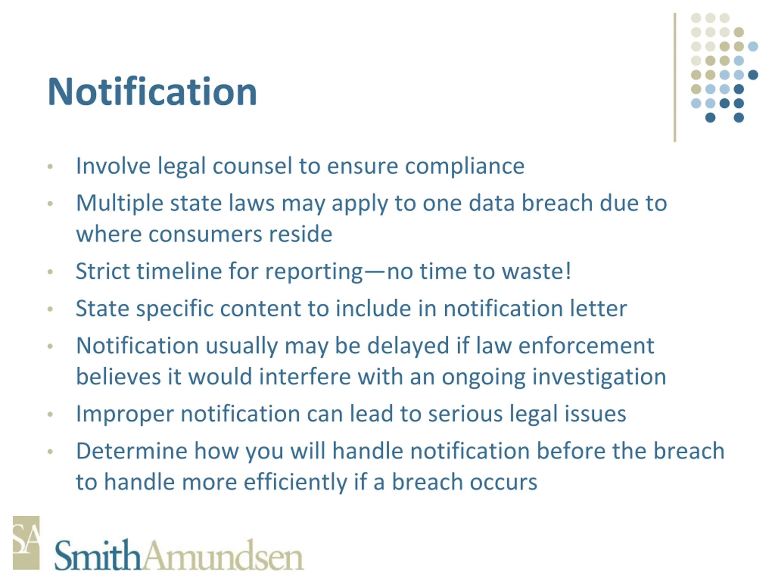 Notification Involve legal counsel to ensure compliance Multiple state laws may apply to one data breach due to where consumers reside Strict timeline for reporting no time to waste! State specific content to include in notification letter Notification usually may be delayed if law enforcement believes it would interfere with an ongoing investigation Improper notification can lead to serious legal issues Determine how you will handle notification before the breach to handle more efficiently if a breach occurs