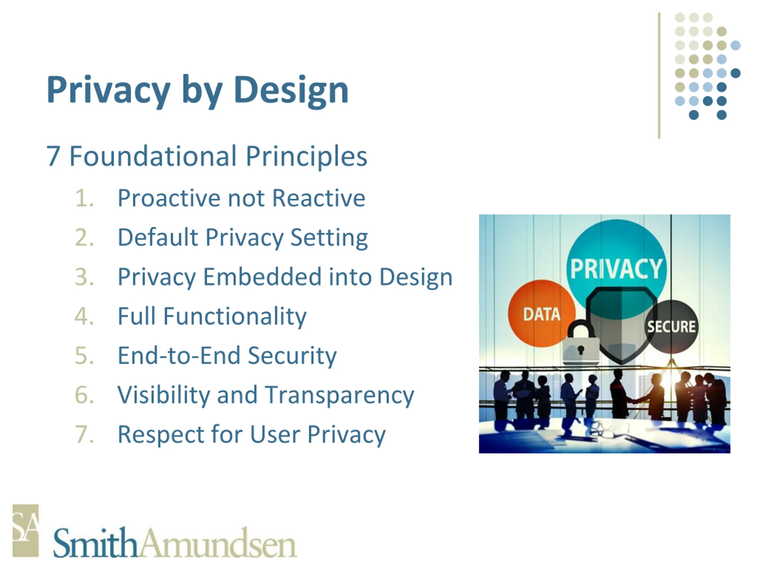 Security by Design Conduct risk assessments Minimize data collected Test security measures Train employees on security measures Address security issues at proper management level Consider vendor and service providers abilities Reasonable access control measures