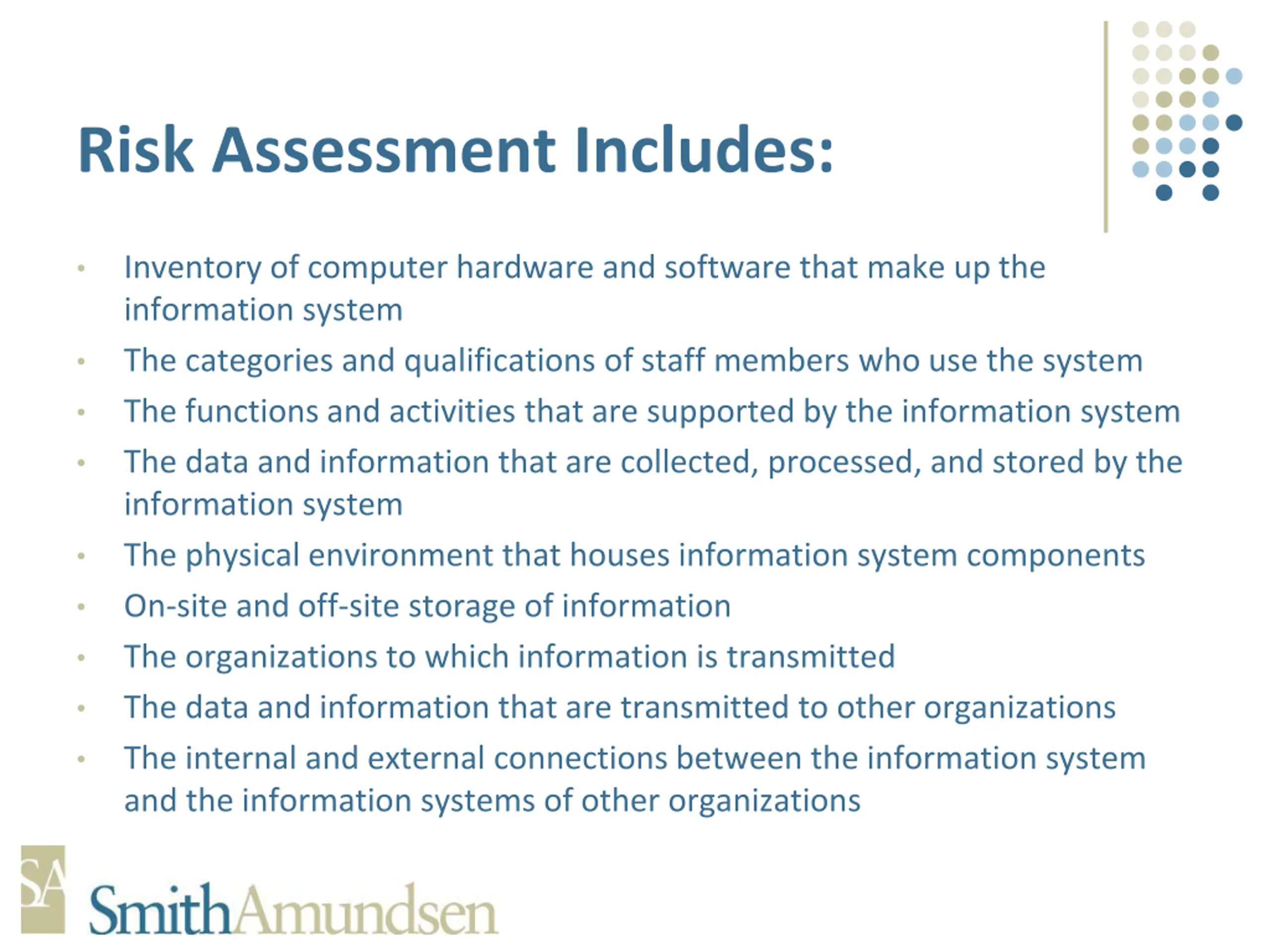 Risk Assessment Includes: Inventory of computer hardware and software that make up the information system The categories and qualifications of staff members who use the system The functions and activities that are supported by the information system The data and information that are collected, processed, and stored by the information system The physical environment that houses information system components On-site and off-site storage of information The organizations to which information is transmitted The data and information that are transmitted to other organizations The internal and external connections between the information system and the information systems of other organizations