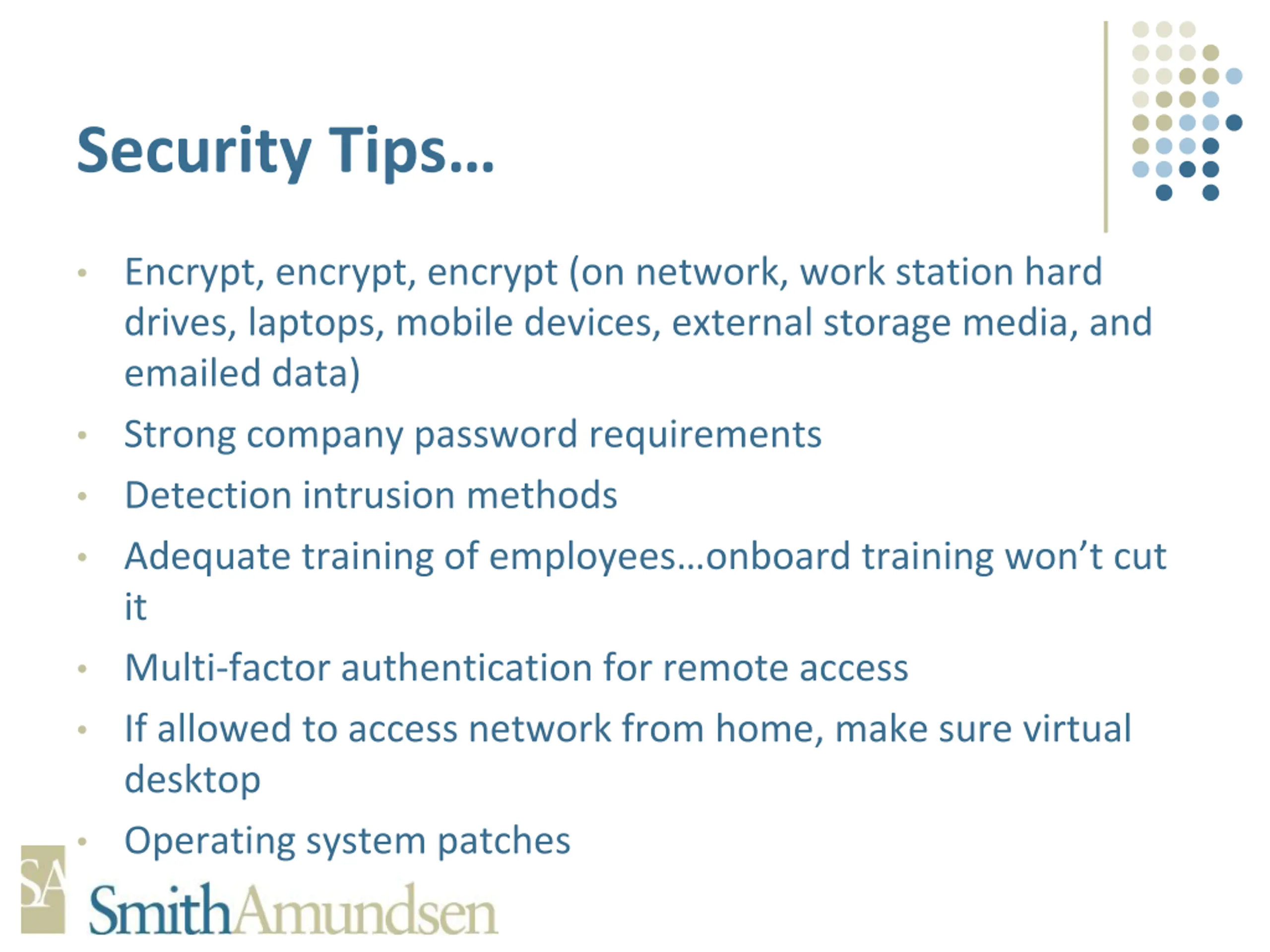 Security Tips Encrypt, encrypt, encrypt (on network, work station hard drives, laptops, mobile devices, external storage media, and emailed data) Strong company password requirements Detection intrusion methods Adequate training of employees onboard training won t cut it Multi-factor authentication for remote access If allowed to access network from home, make sure virtual desktop Operating system patches