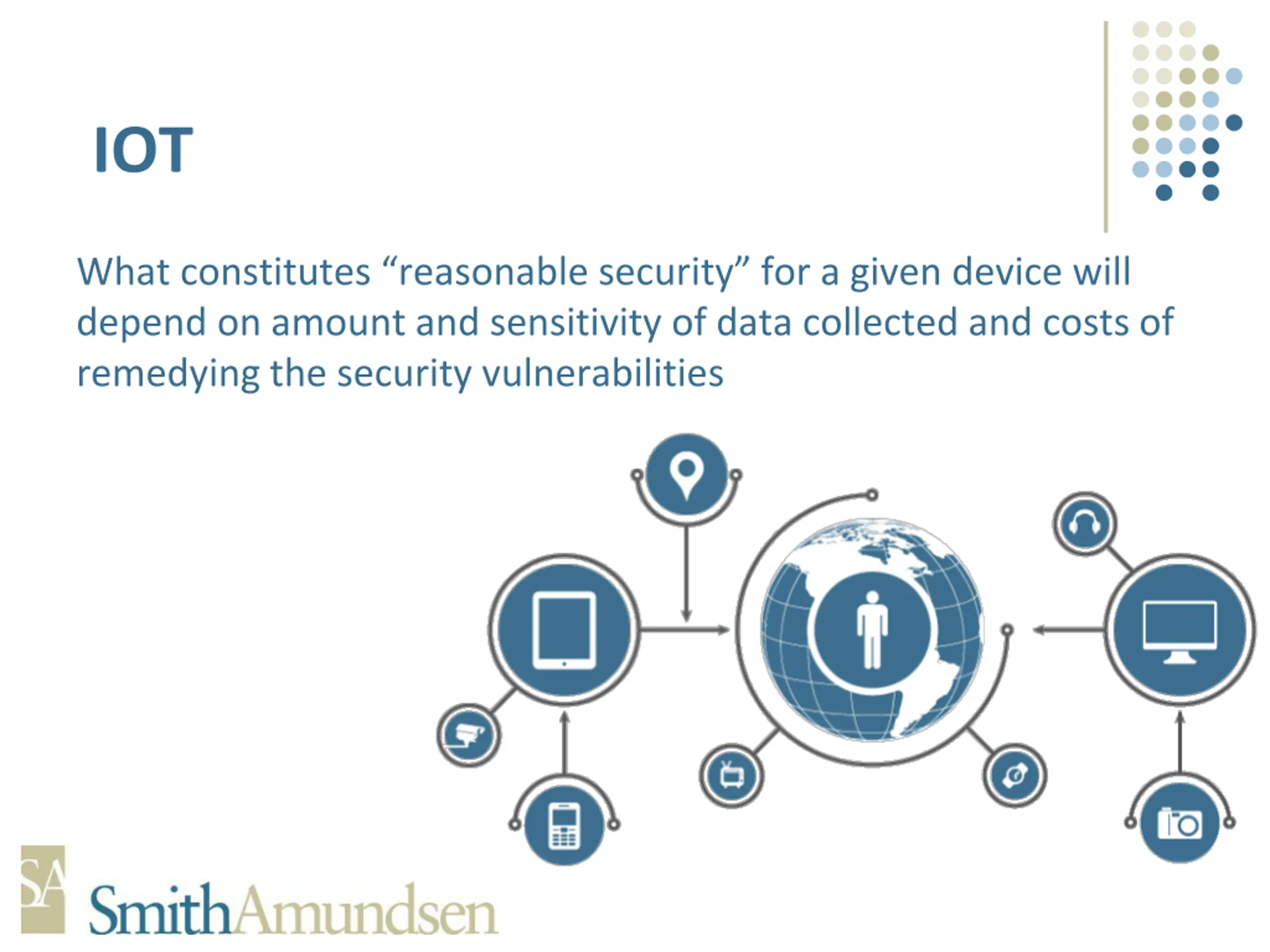 IOT What constitutes reasonable security for a given device will depend on amount and sensitivity of data collected and costs of remedying the security vulnerabilities