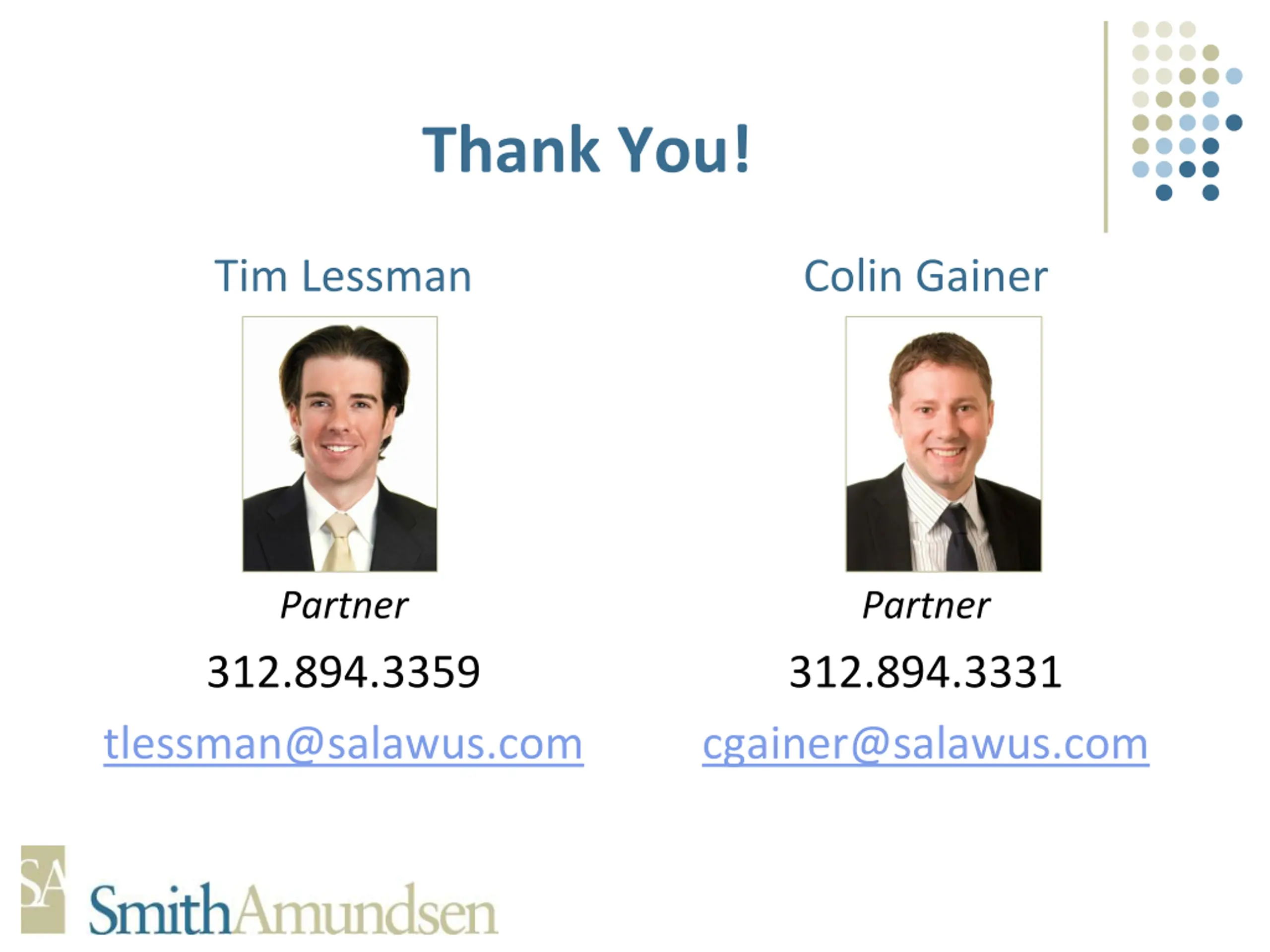 Thank You! Tim Lessman Colin Gainer Partner Partner 312.894.3359 tlessman@salawus.com 312.894.3331 cgainer@salawus.com