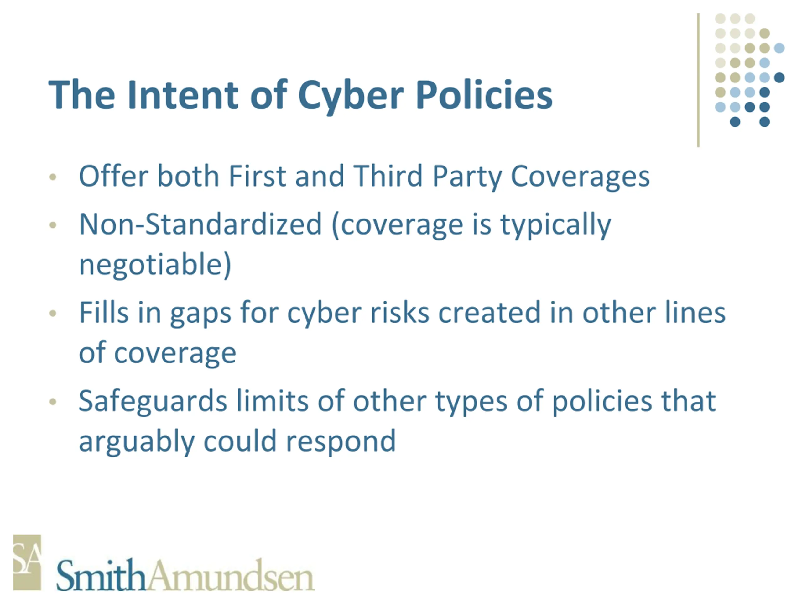 The Intent of Cyber Policies Offer both First and Third Party Coverages Non-Standardized (coverage is typically negotiable) Fills in gaps for cyber risks created in other lines of coverage Safeguards limits of other types of policies that arguably could respond