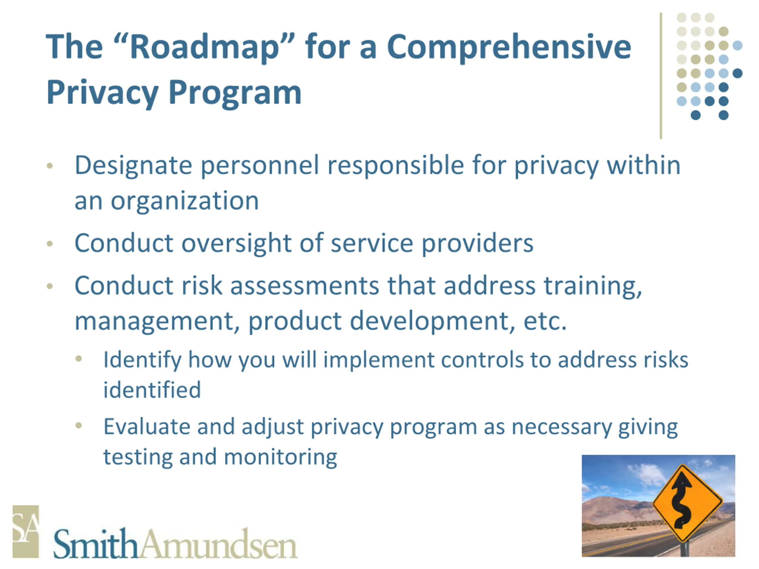 The Roadmap for a Comprehensive Privacy Program Designate personnel responsible for privacy within an organization Conduct oversight of service providers Conduct risk assessments that address training, management, product development, etc. Identify how you will implement controls to address risks identified Evaluate and adjust privacy program as necessary giving testing and monitoring