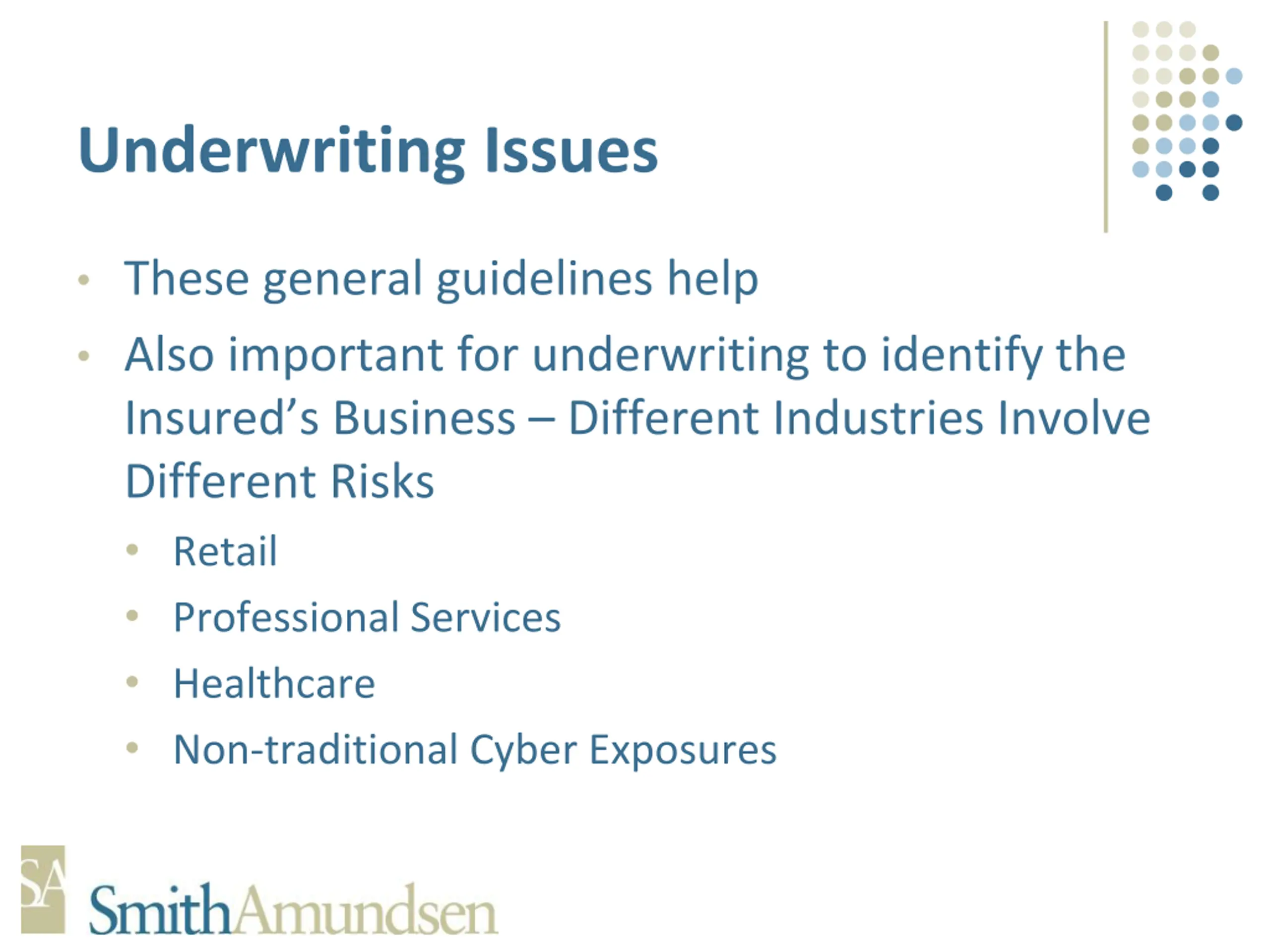 Underwriting Issues These general guidelines help Also important for underwriting to identify the Insured s Business Different Industries Involve Different Risks Retail Professional Services Healthcare Non-traditional Cyber Exposures