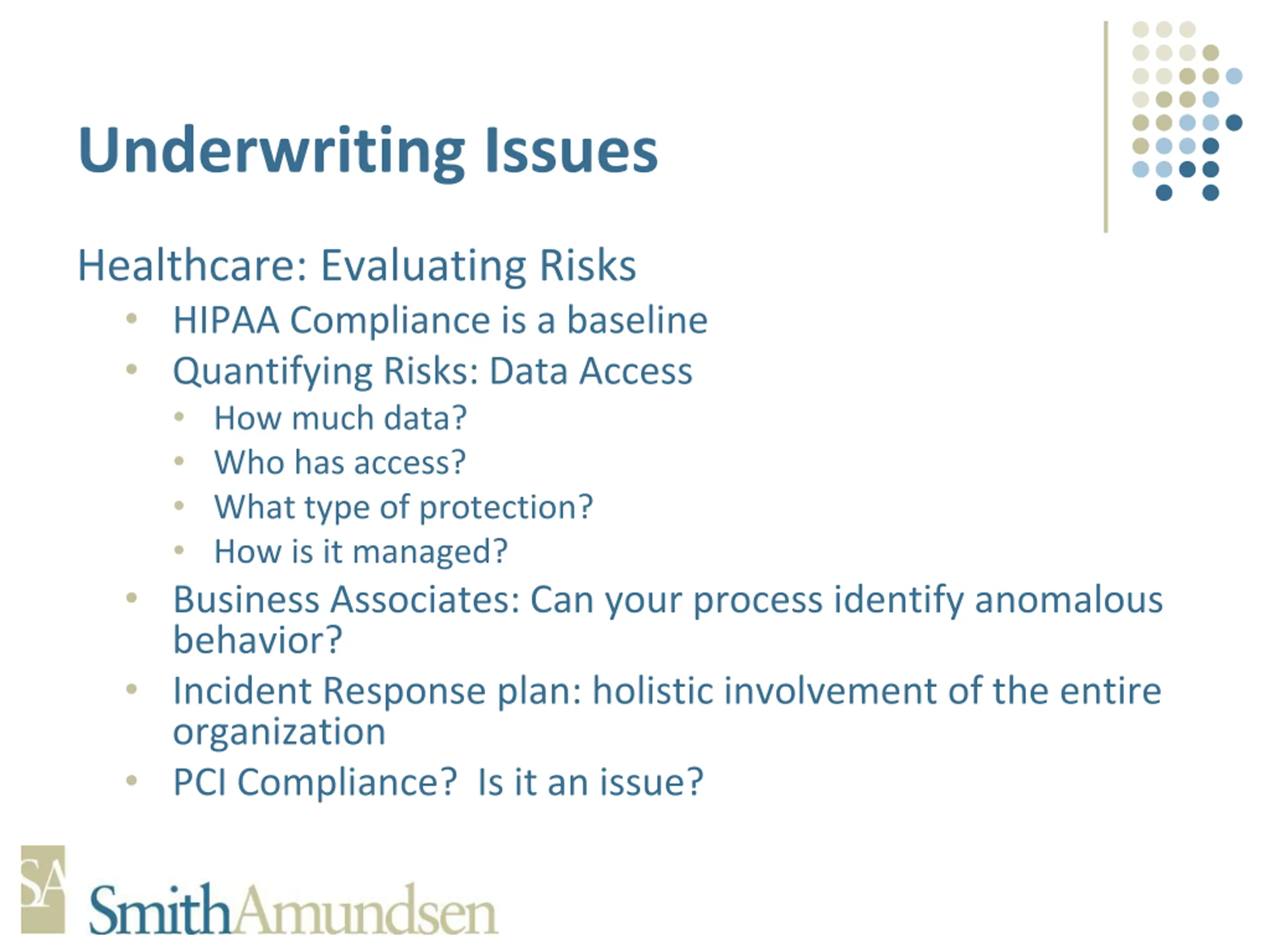 Underwriting Issues Healthcare: Evaluating Risks HIPAA Compliance is a baseline Quantifying Risks: Data Access How much data? Who has access? What type of protection? How is it managed? Business Associates: Can your process identify anomalous behavior? Incident Response plan: holistic involvement of the entire organization PCI Compliance? Is it an issue?