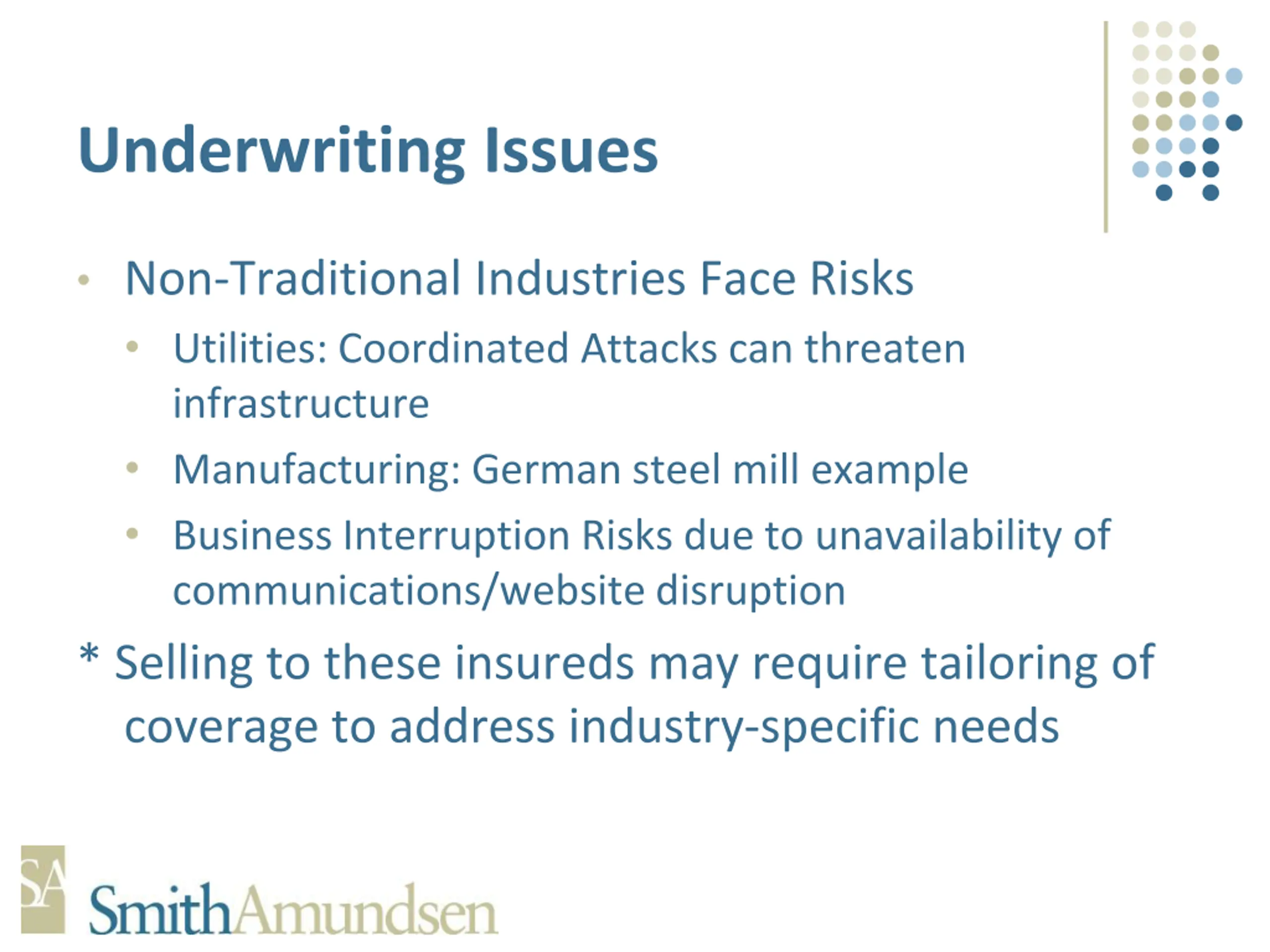 Underwriting Issues Non-Traditional Industries Face Risks Utilities: Coordinated Attacks can threaten infrastructure Manufacturing: German steel mill example Business Interruption Risks due to unavailability of communications/website disruption * Selling to these insureds may require tailoring of coverage to address industry-specific needs