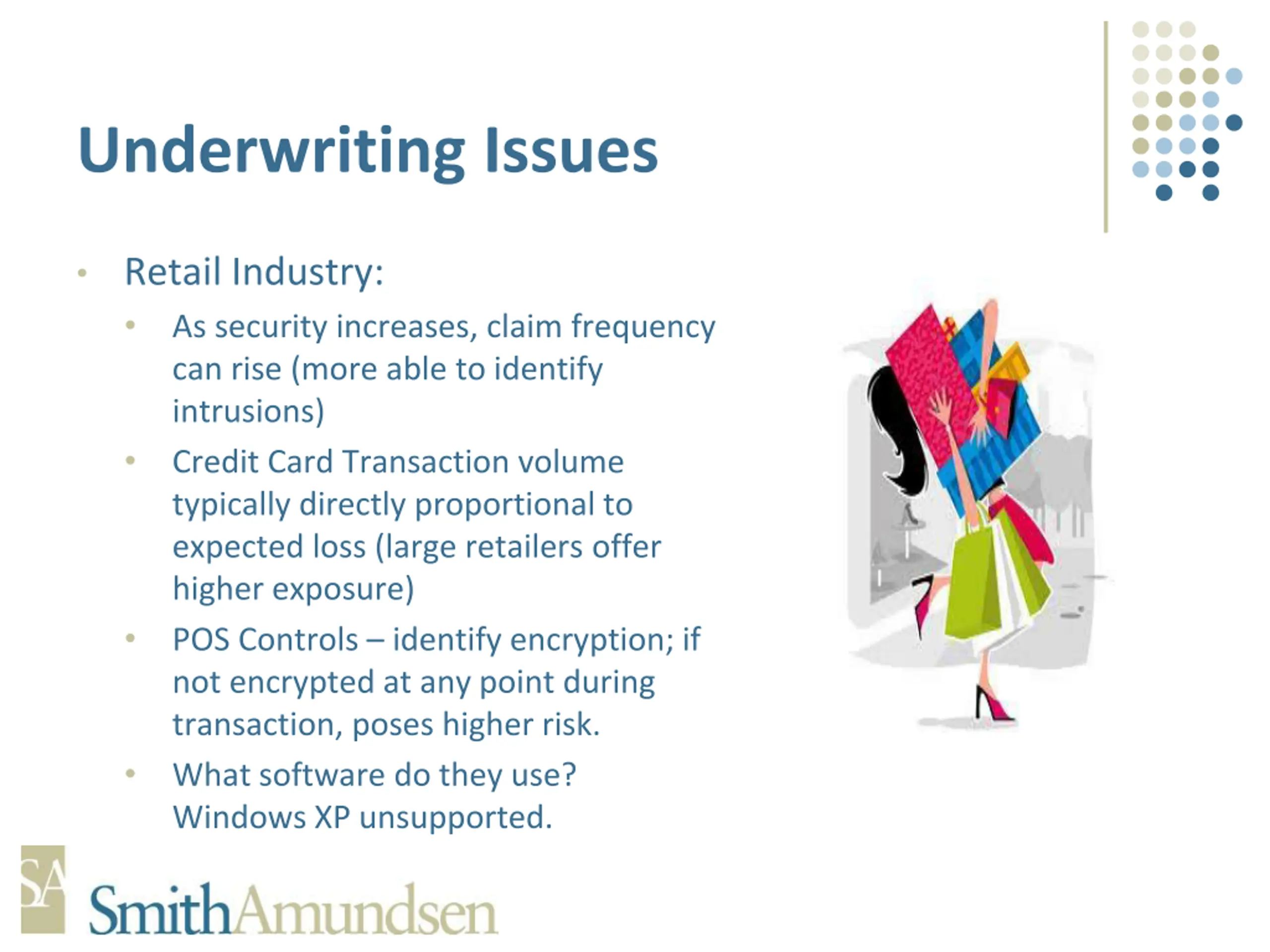 Underwriting Issues Retail Industry: As security increases, claim frequency can rise (more able to identify intrusions) Credit Card Transaction volume typically directly proportional to expected loss (large retailers offer higher exposure) POS Controls identify encryption; if not encrypted at any point during transaction, poses higher risk. What software do they use? Windows XP unsupported.