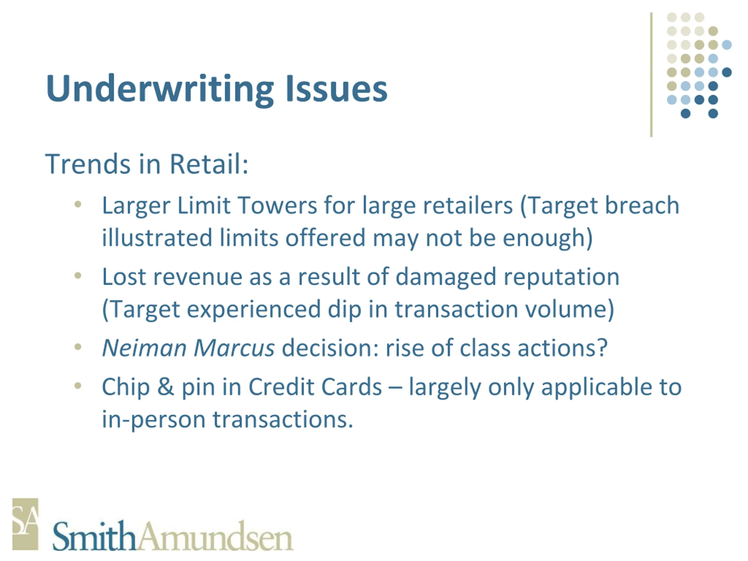 Underwriting Issues Trends in Retail: Larger Limit Towers for large retailers (Target breach illustrated limits offered may not be enough) Lost revenue as a result of damaged reputation (Target experienced dip in transaction volume) Neiman Marcus decision: rise of class actions? Chip & pin in Credit Cards largely only applicable to in-person transactions.