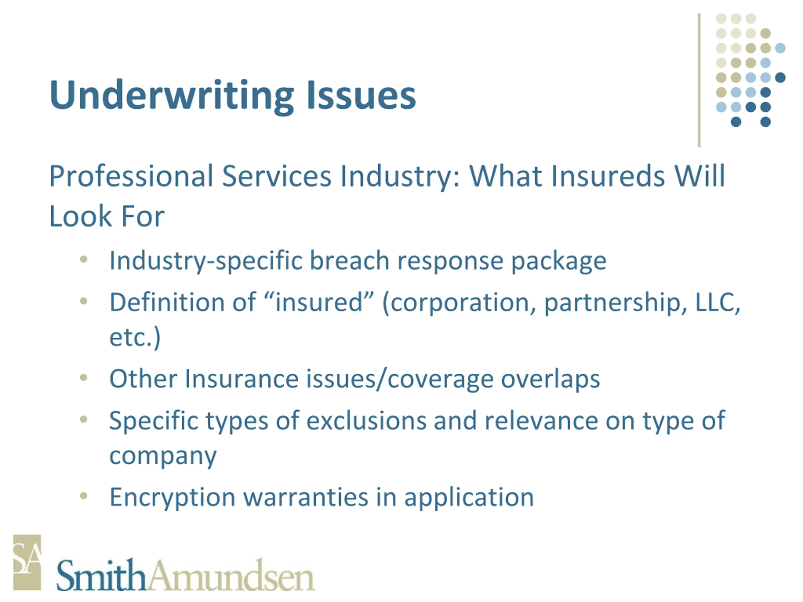 Underwriting Issues Professional Services Industry: What Insureds Will Look For Industry-specific breach response package Definition of insured (corporation, partnership, LLC, etc.) Other Insurance issues/coverage overlaps Specific types of exclusions and relevance on type of company Encryption warranties in application