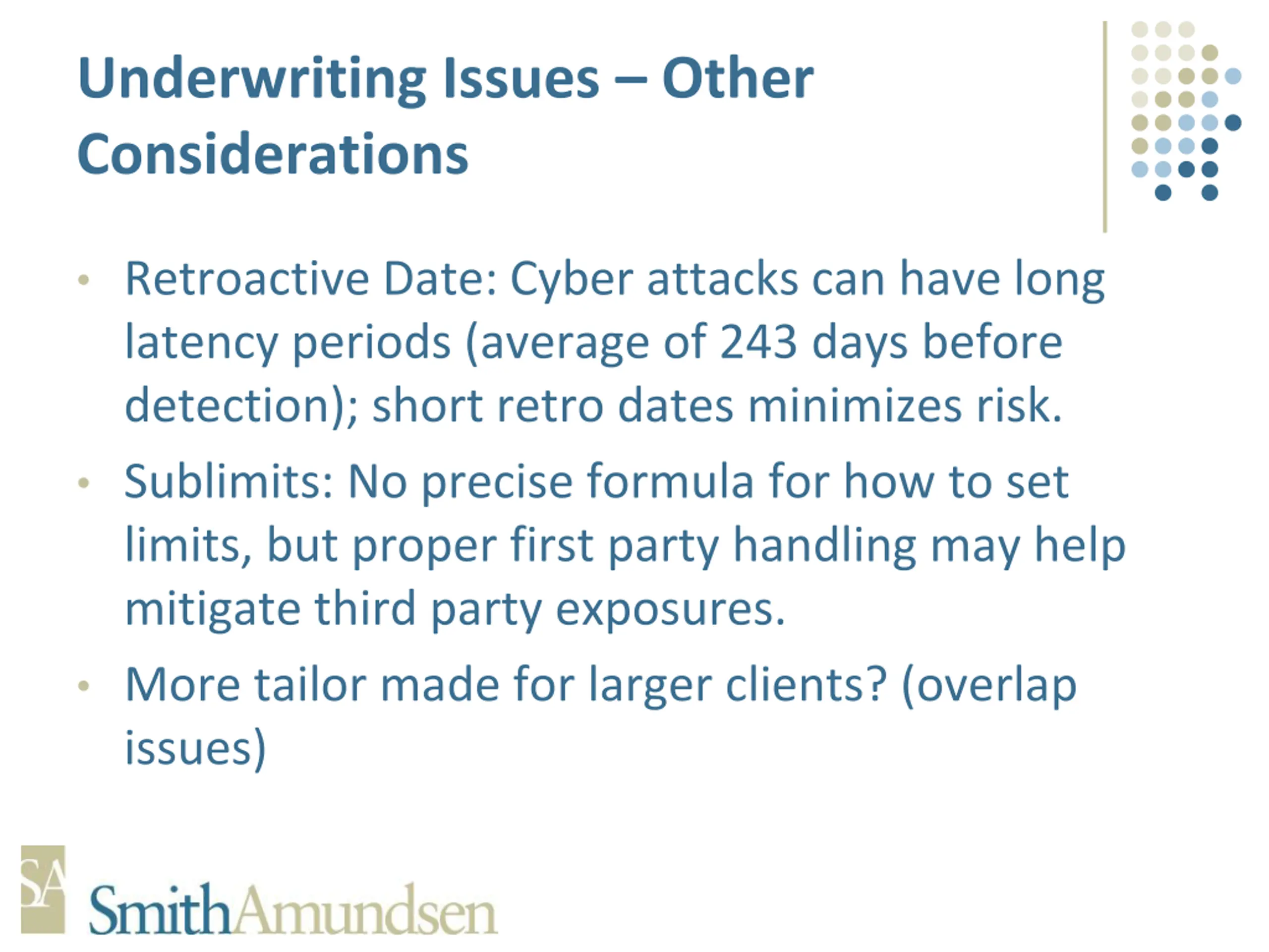Underwriting Issues Other Considerations Retroactive Date: Cyber attacks can have long latency periods (average of 243 days before detection); short retro dates minimizes risk. Sublimits: No precise formula for how to set limits, but proper first party handling may help mitigate third party exposures. More tailor made for larger clients? (overlap issues)