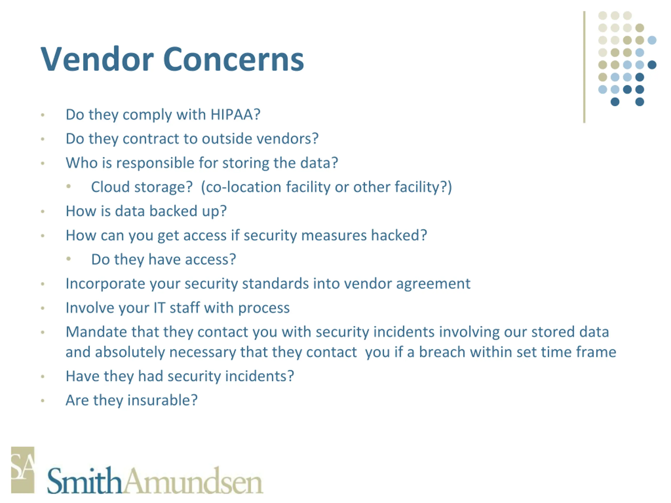 Vendor Concerns Do they comply with HIPAA? Do they contract to outside vendors? Who is responsible for storing the data? Cloud storage? (co-location facility or other facility?) How is data backed up? How can you get access if security measures hacked? Do they have access? Incorporate your security standards into vendor agreement Involve your IT staff with process Mandate that they contact you with security incidents involving our stored data and absolutely necessary that they contact you if a breach within set time frame Have they had security incidents? Are they insurable?