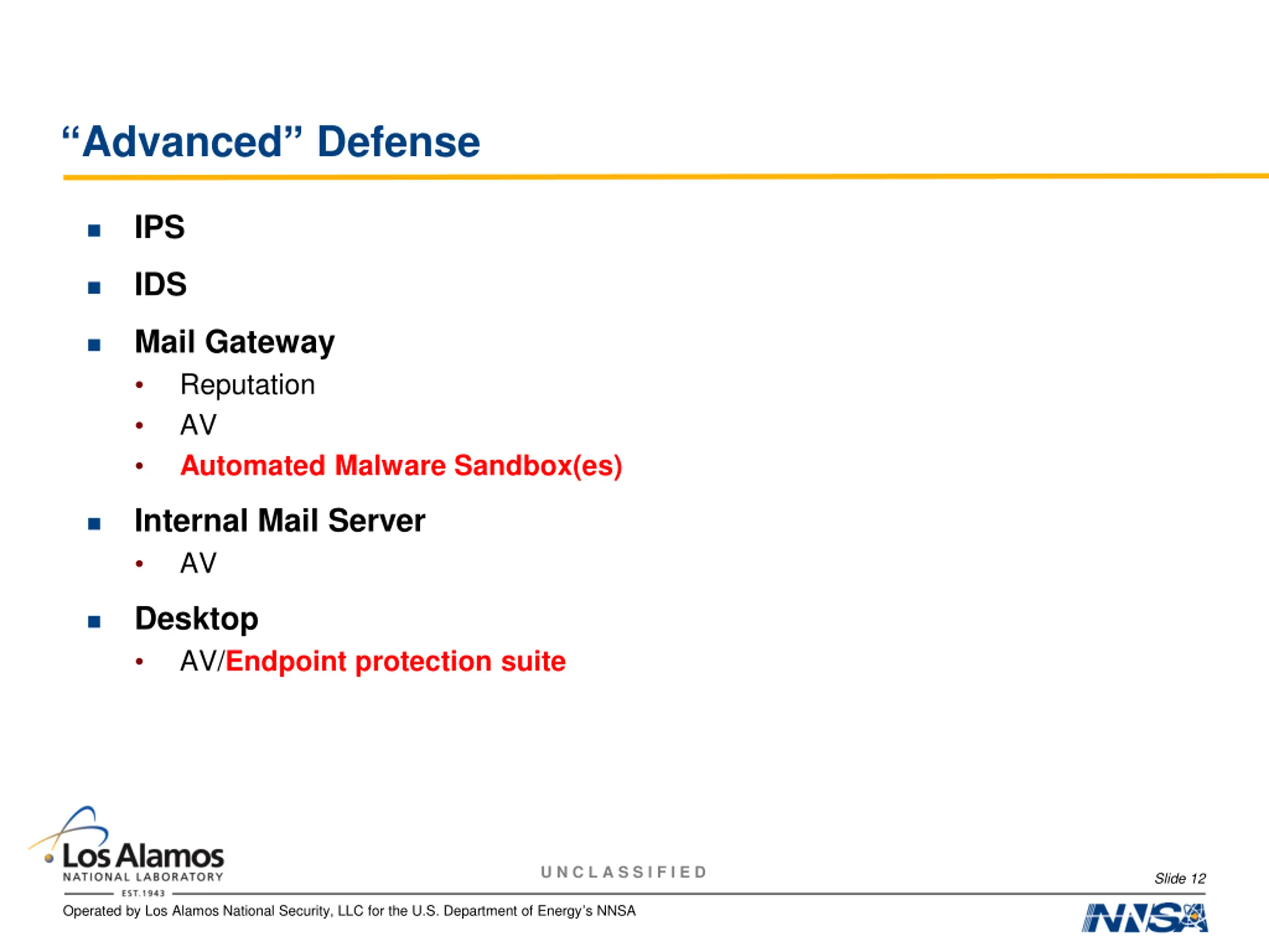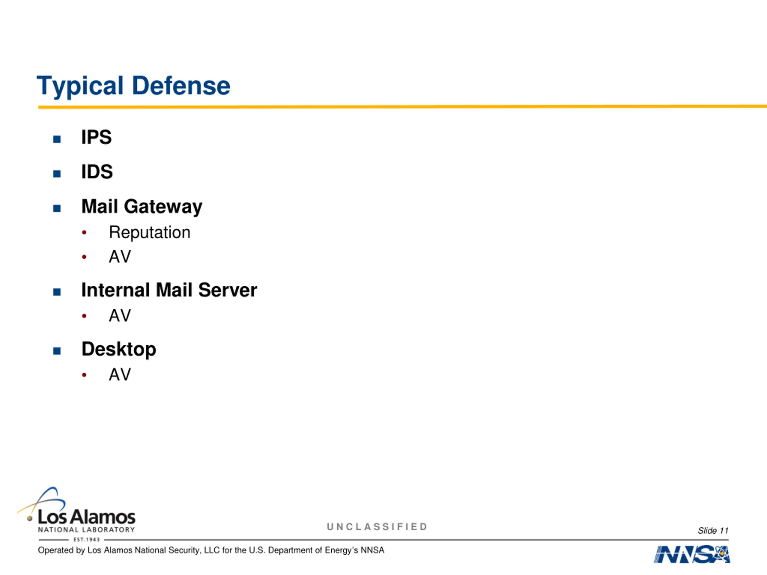 Typical Defense IPS IDS Mail Gateway Reputation AV Internal Mail Server AV Desktop AV U N C L A S S I F I E D Slide 11 Operated by Los Alamos National Security, LLC for the U.S. Department of Energy s NNSA
