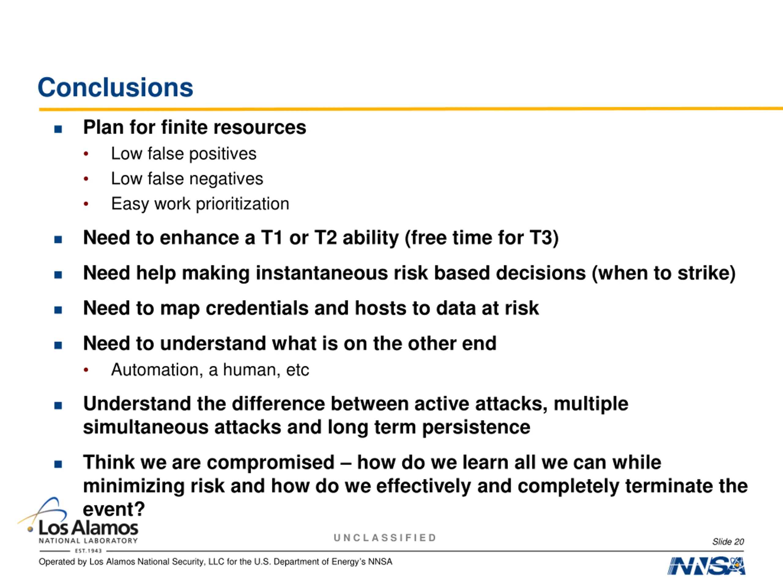 Conclusions Plan for finite resources Low false positives Low false negatives Easy work prioritization Need to enhance a T1 or T2 ability (free time for T3) Need help making instantaneous risk based decisions (when to strike) Need to map credentials and hosts to data at risk Need to understand what is on the other end Automation, a human, etc Understand the difference between active attacks, multiple simultaneous attacks and long term persistence Think we are compromised how do we learn all we can while minimizing risk and how do we effectively and completely terminate the event? U N C L A S S I F I E D Slide 20 Operated by Los Alamos National Security, LLC for the U.S. Department of Energy s NNSA