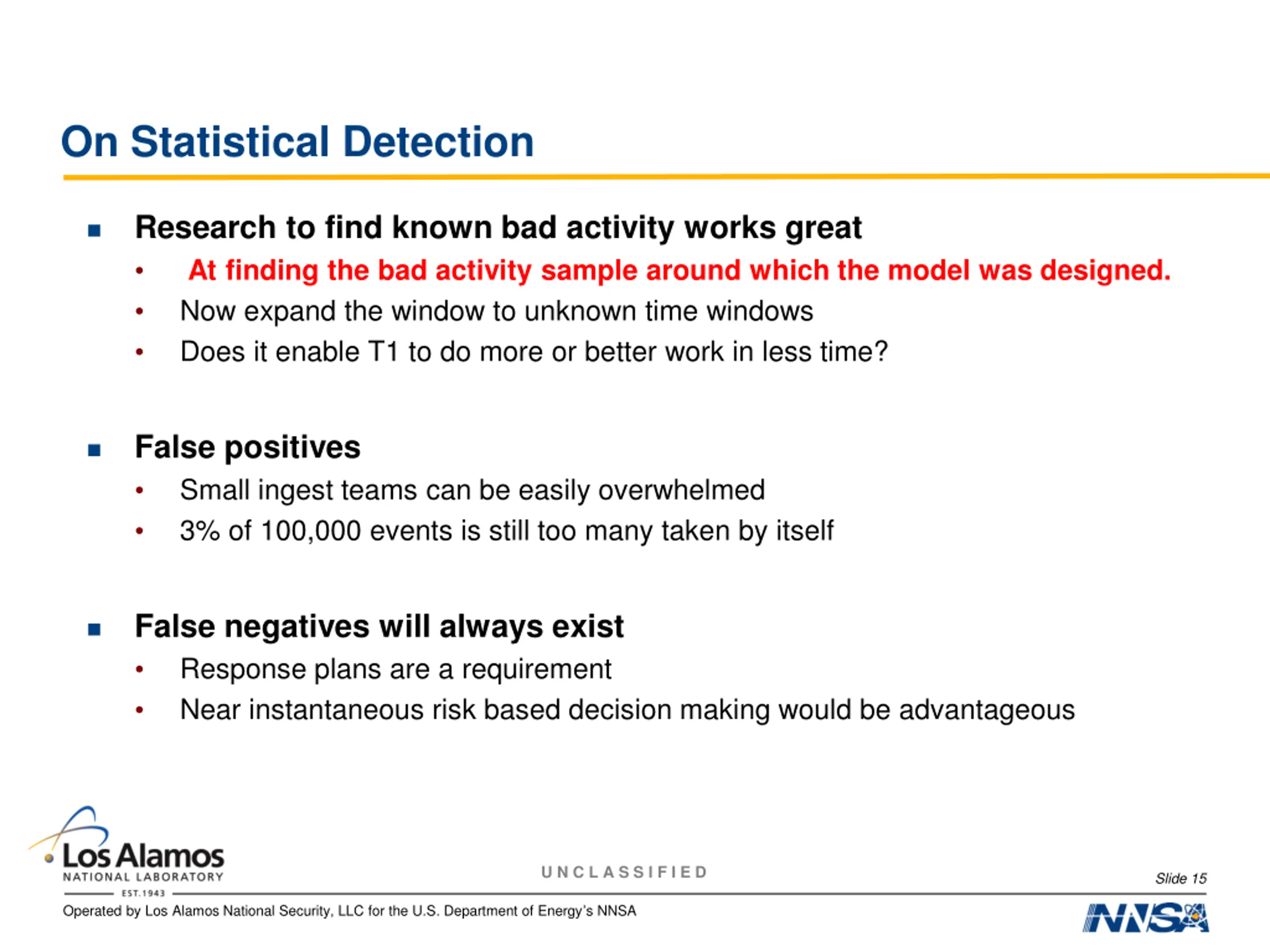 On Statistical Detection Research to find known bad activity works great At finding the bad activity sample around which the model was designed. Now expand the window to unknown time windows Does it enable T1 to do more or better work in less time? False positives Small ingest teams can be easily overwhelmed 3% of 100,000 events is still too many taken by itself False negatives will always exist Response plans are a requirement Near instantaneous risk based decision making would be advantageous U N C L A S S I F I E D Slide 15 Operated by Los Alamos National Security, LLC for the U.S. Department of Energy s NNSA