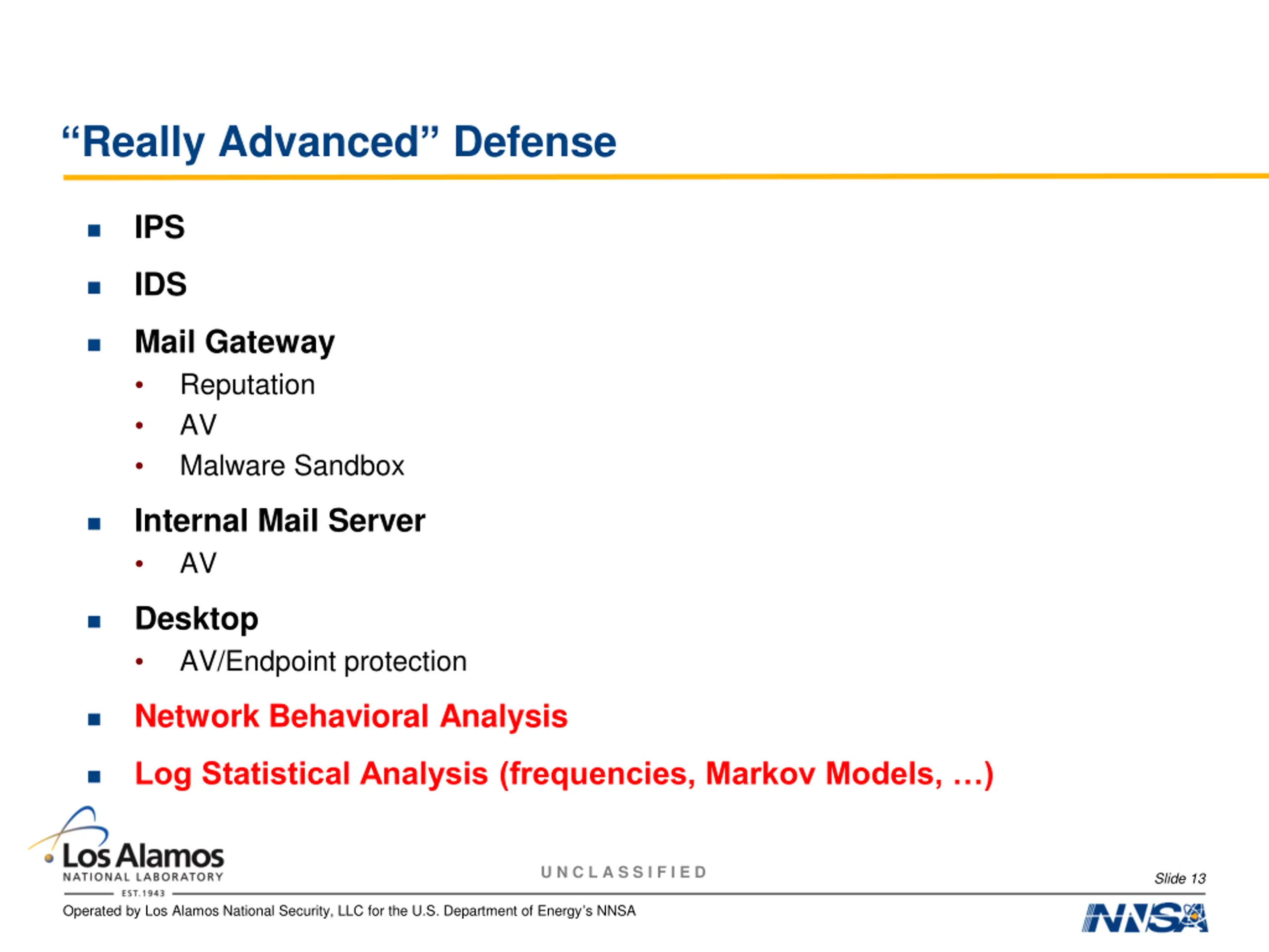 Advanced Defense IPS IDS Mail Gateway Reputation AV Automated Malware Sandbox(es) Internal Mail Server AV Desktop AV/Endpoint protection suite U N C L A S S I F I E D Slide 12 Operated by Los Alamos National Security, LLC for the U.S. Department of Energy s NNSA